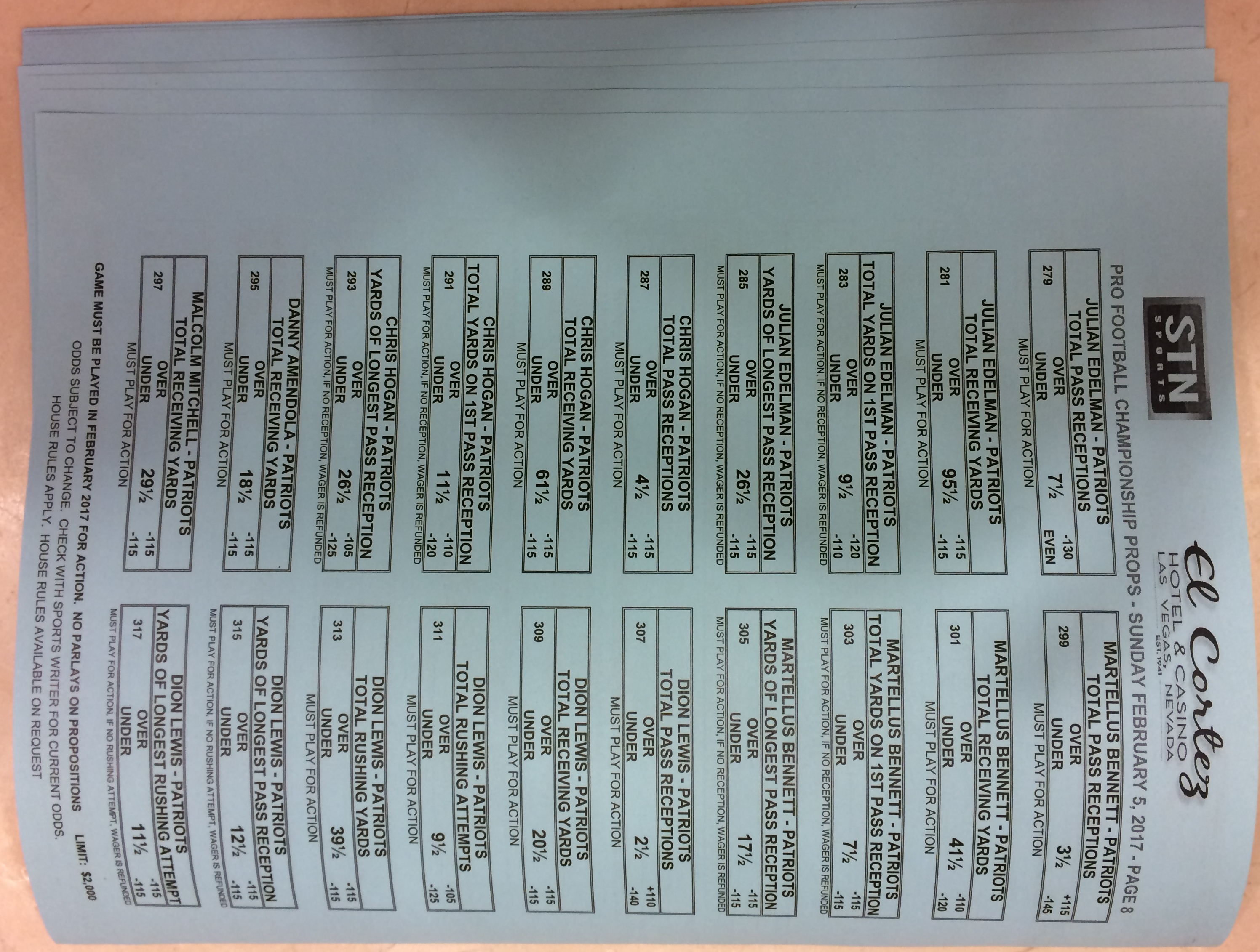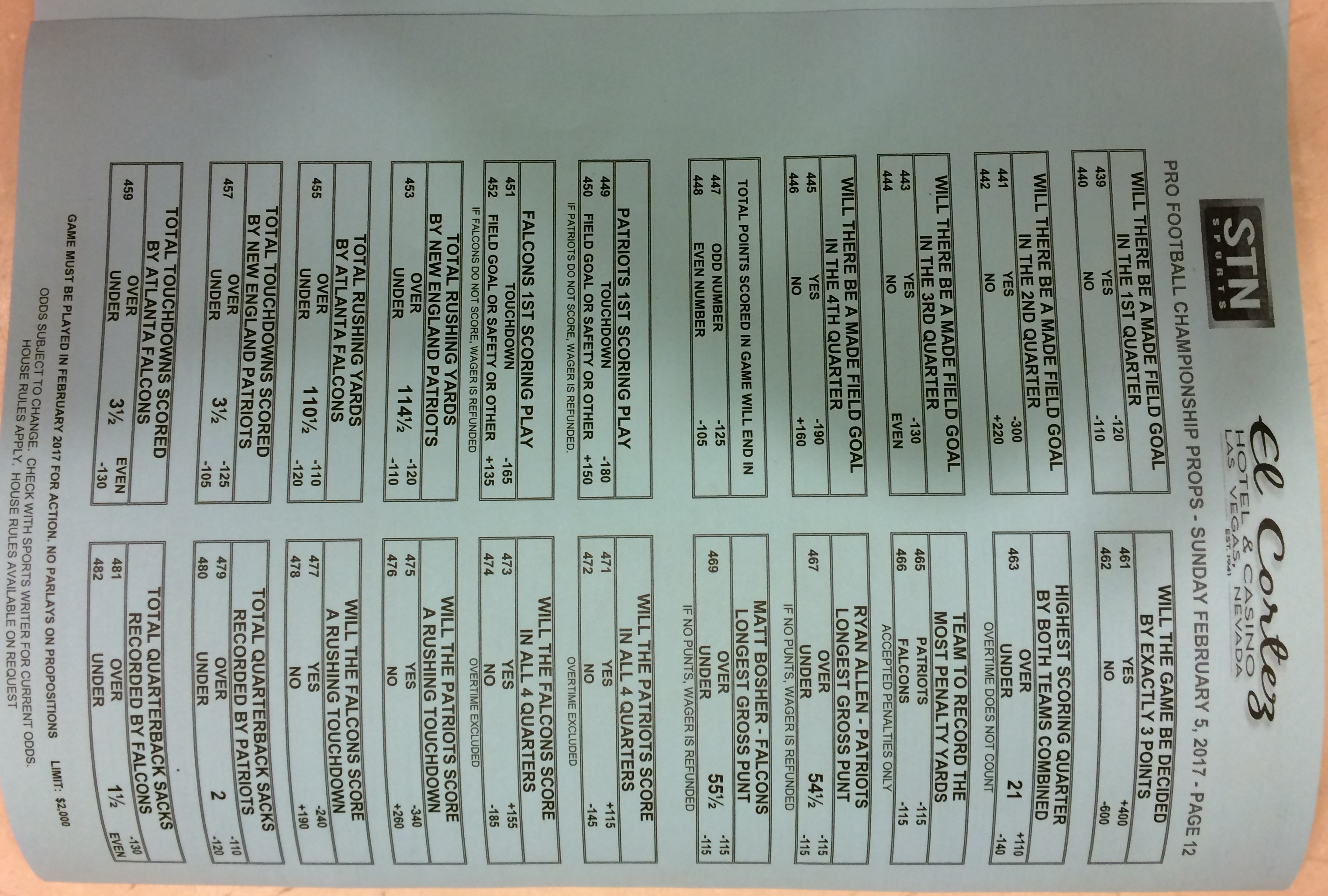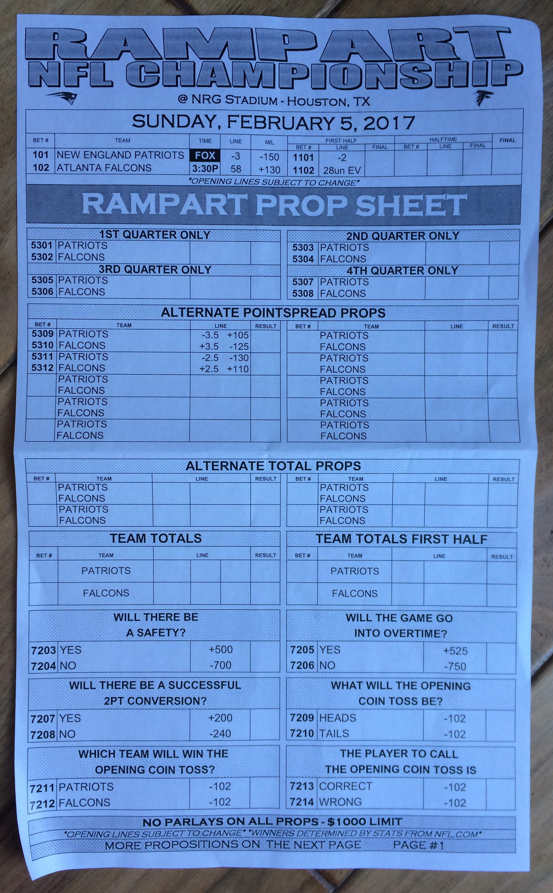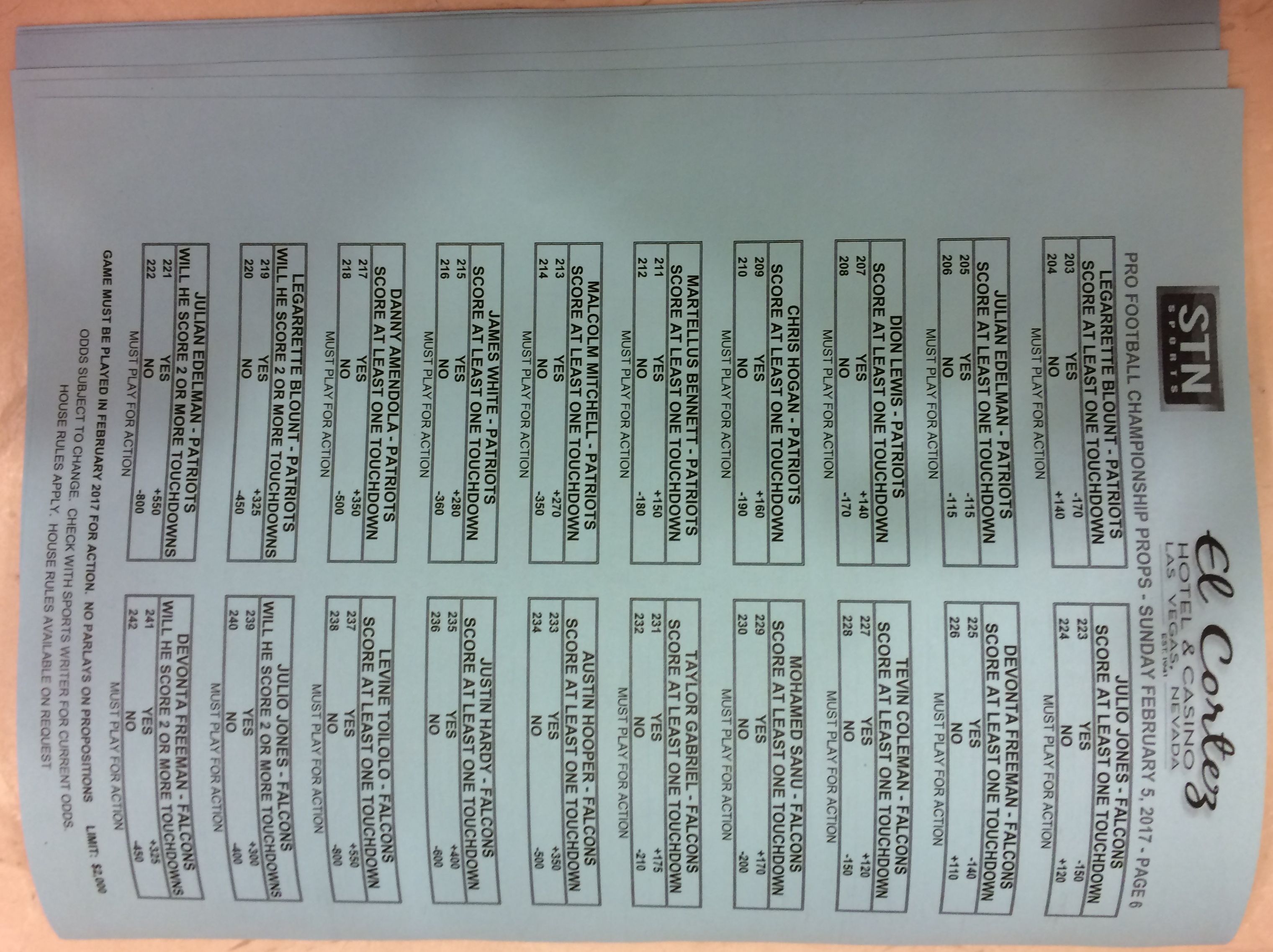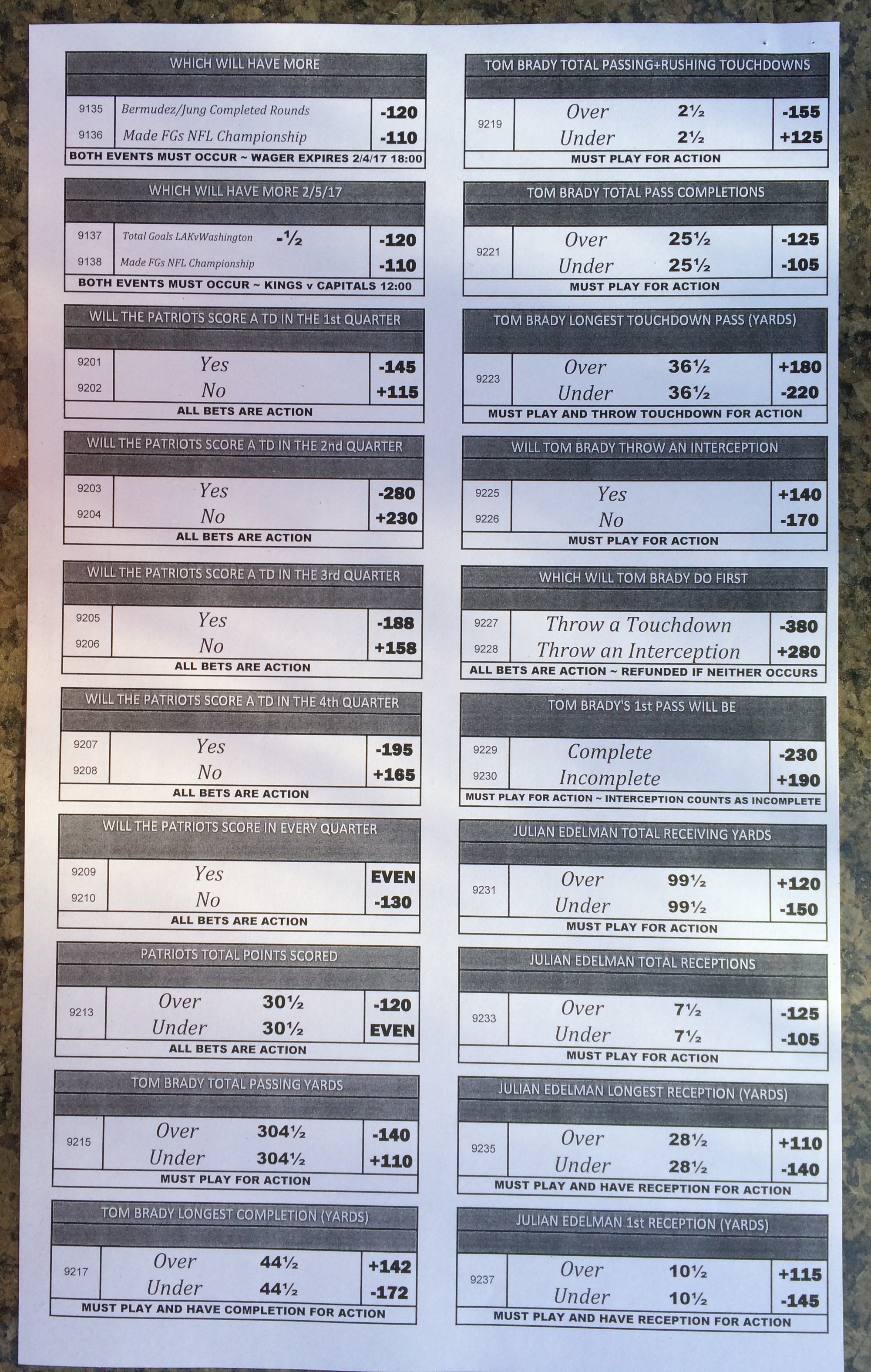 Embora eu não vá dar nenhum palpite este ano, você pode pelo menos ver o que está disponível. Aqui estão algumas imagens de planilhas de apostas para o Super Bowl 51. Mais devem aparecer nos dias que antecedem o jogo.