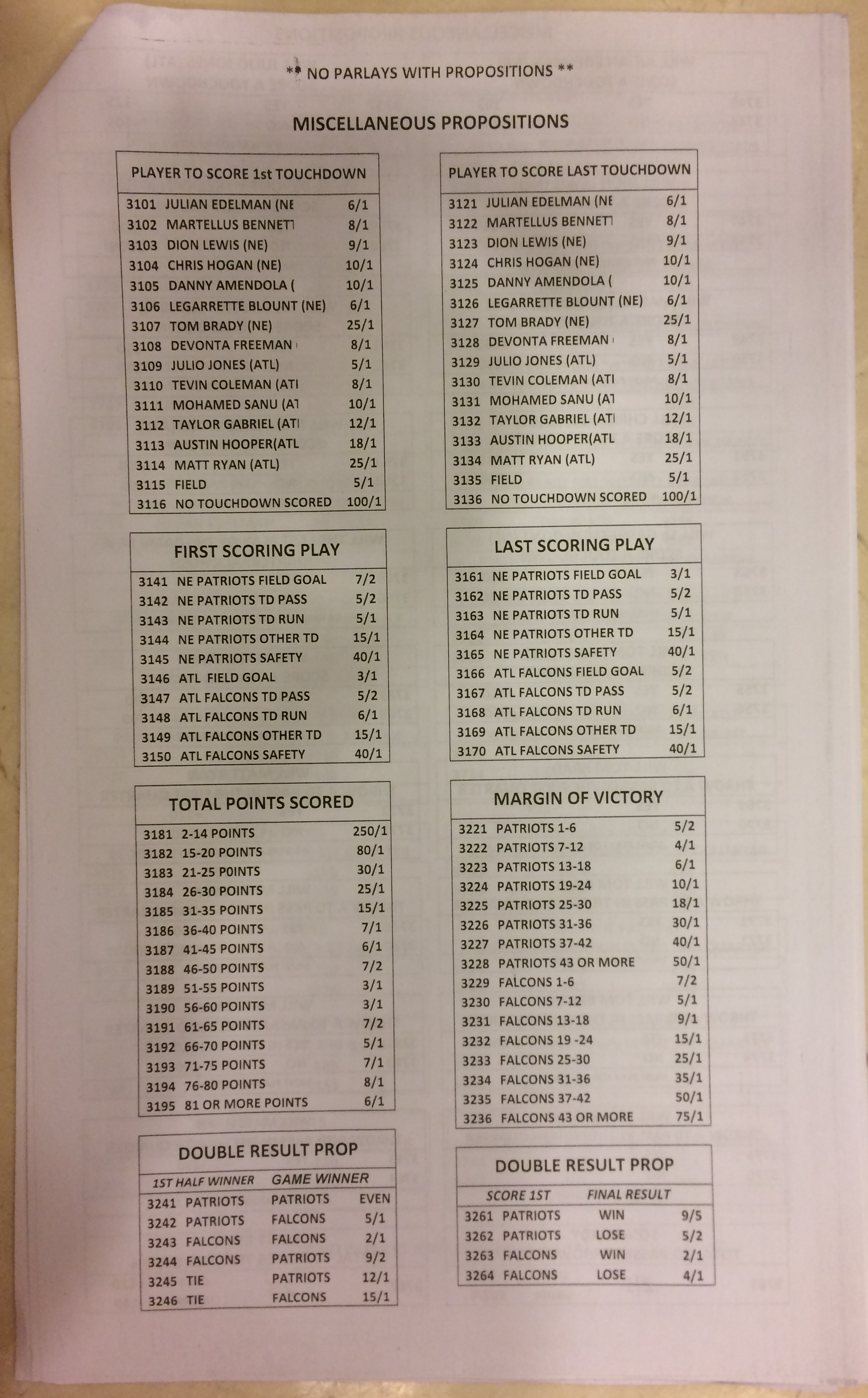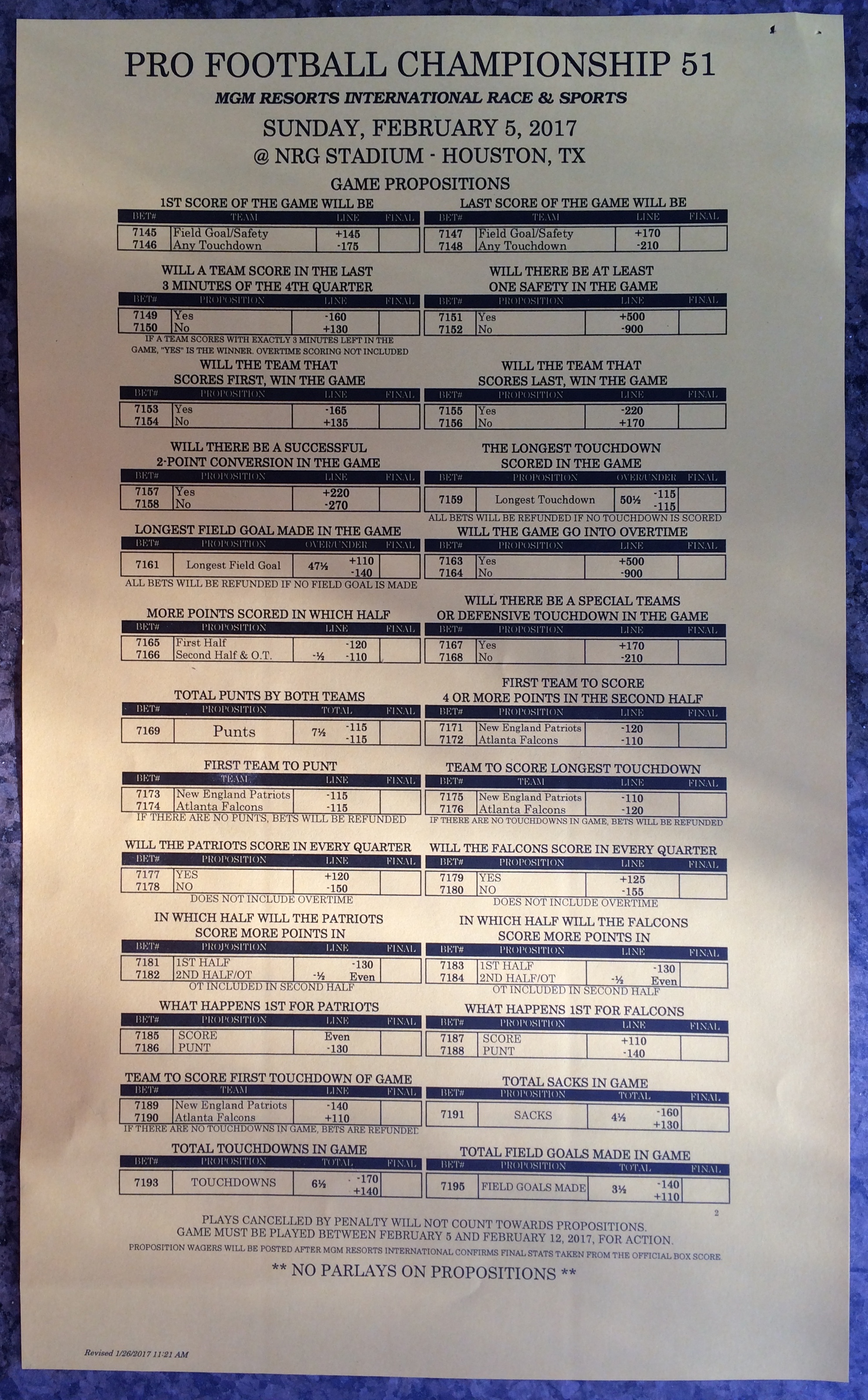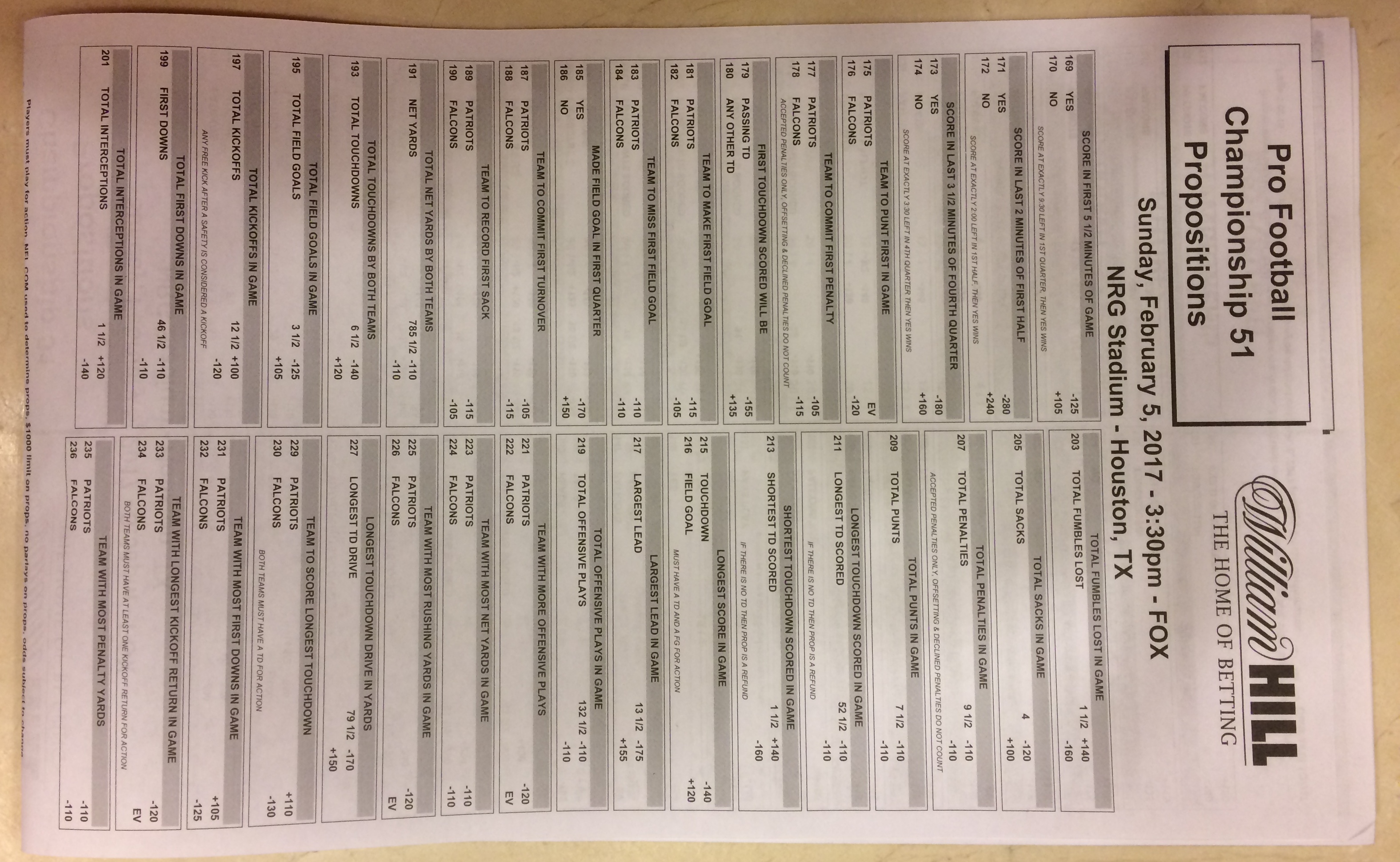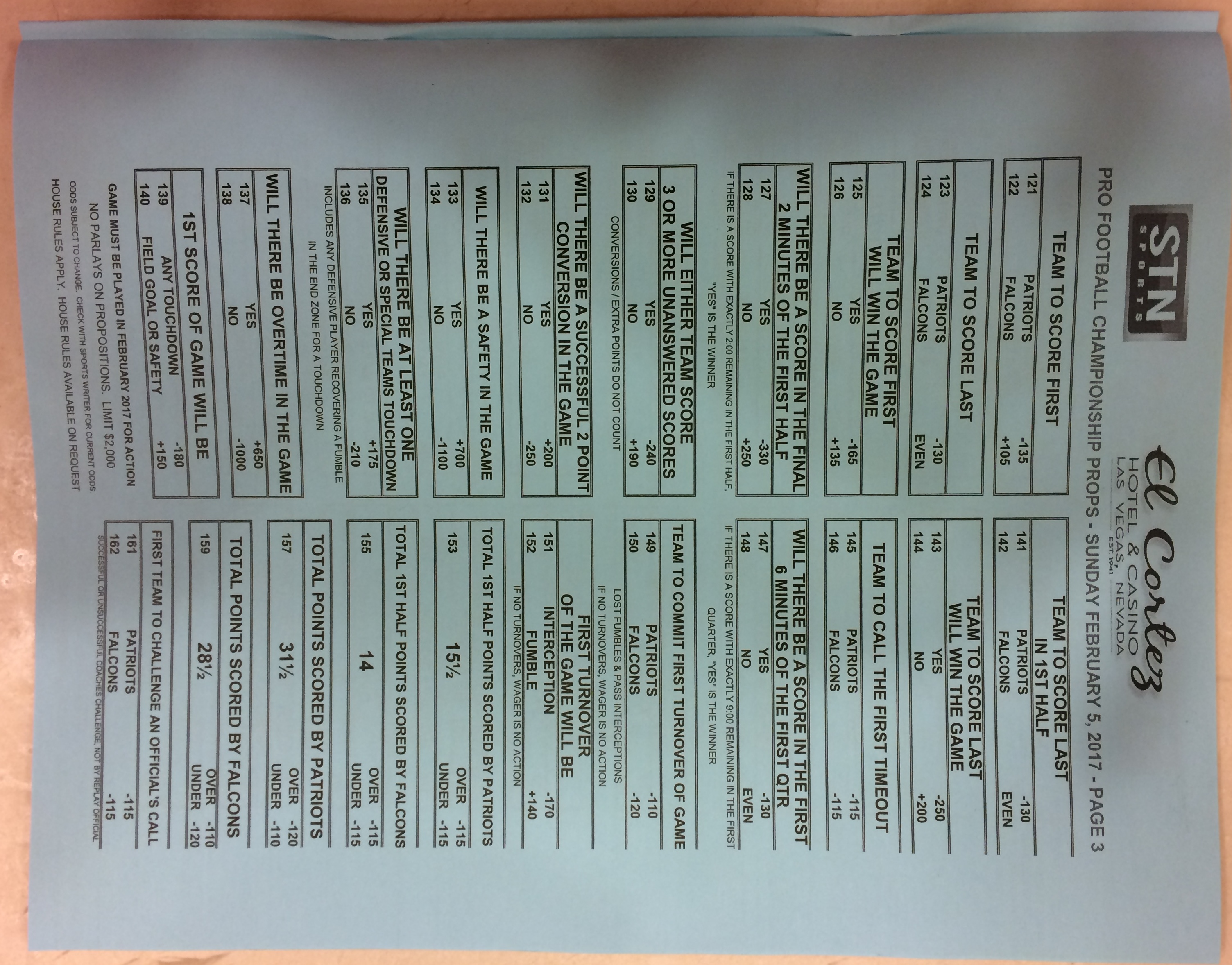Embora eu não vá dar nenhum palpite este ano, você pode pelo menos ver o que está disponível. Aqui estão algumas imagens de planilhas de apostas para o Super Bowl 51. Mais devem aparecer nos dias que antecedem o jogo.