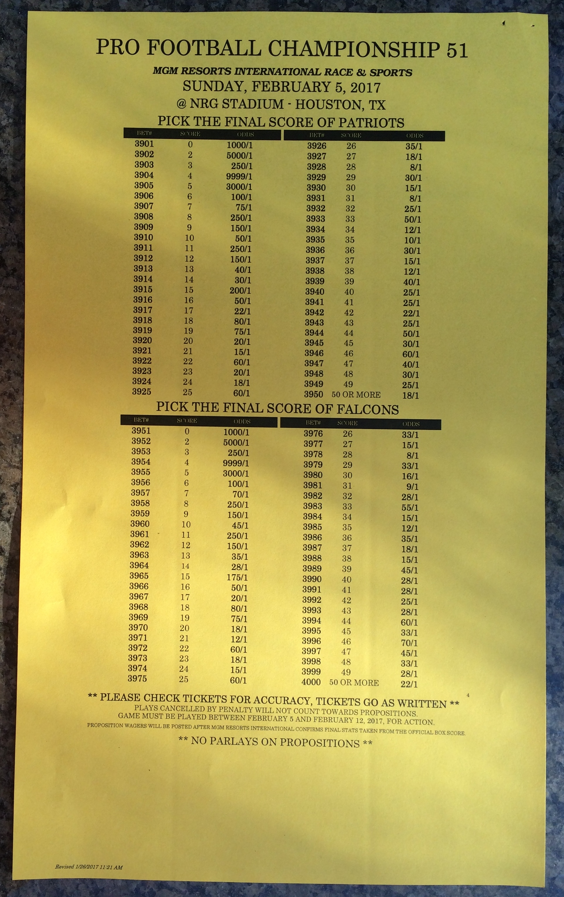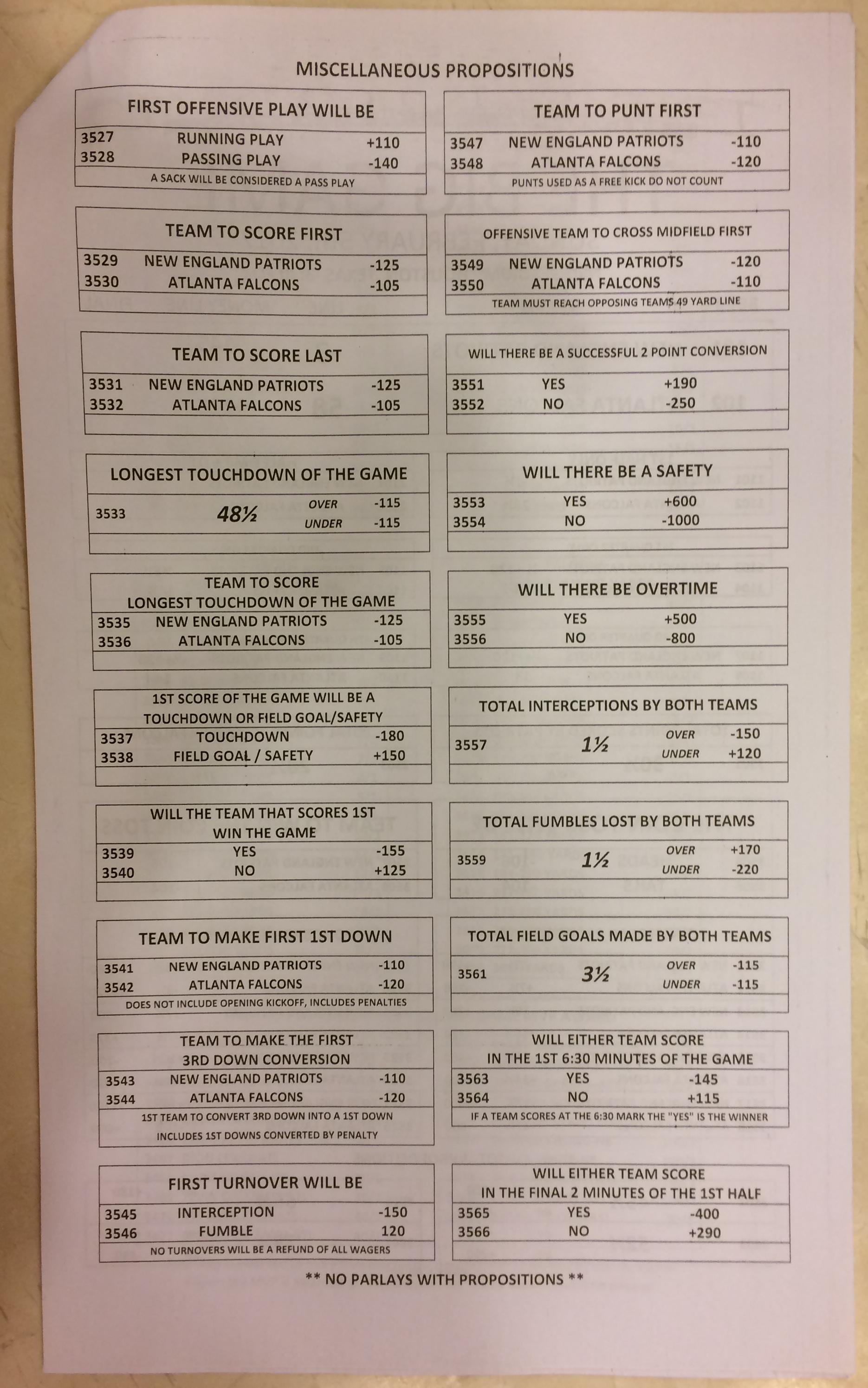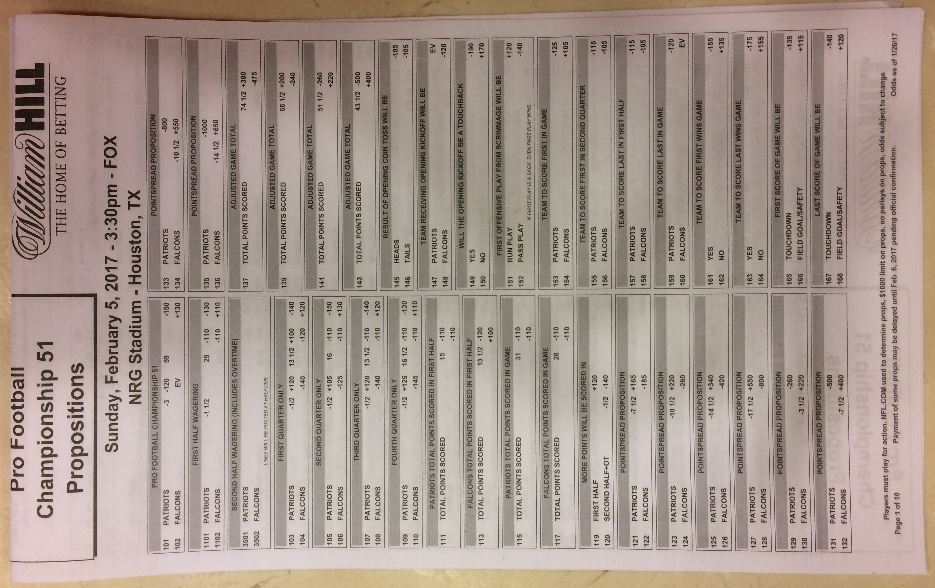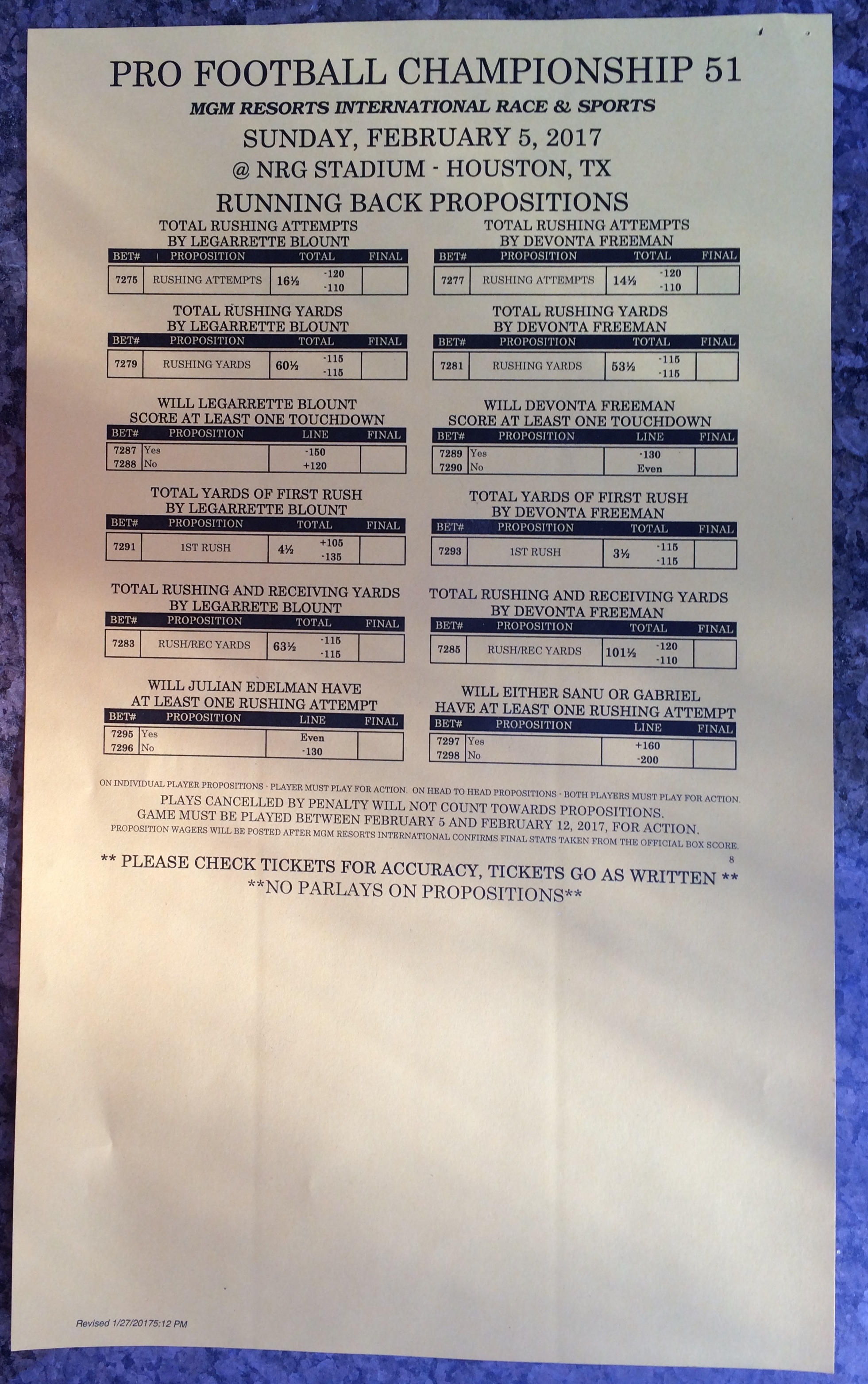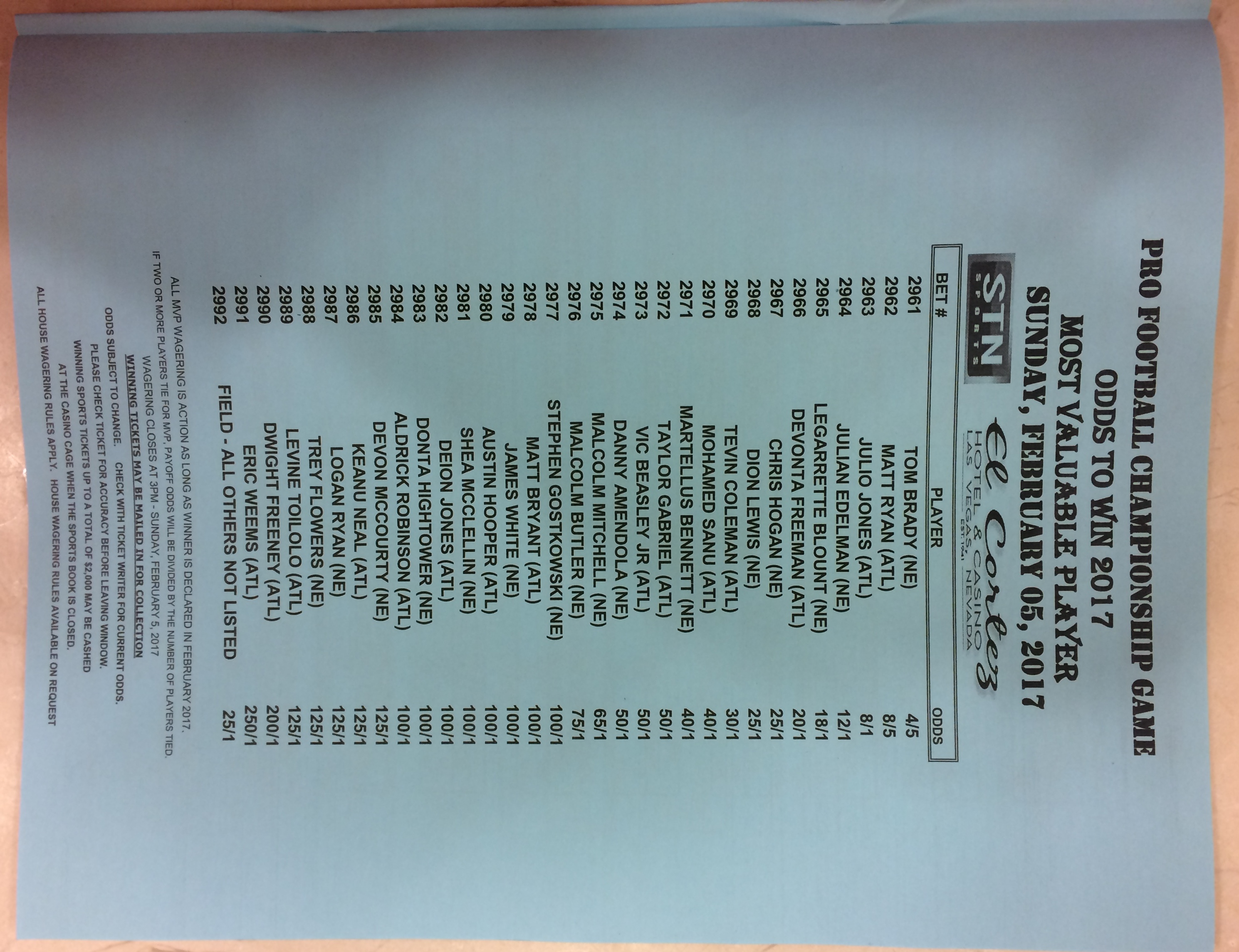 Embora eu não vá dar nenhum palpite este ano, você pode pelo menos ver o que está disponível. Aqui estão algumas imagens de planilhas de apostas para o Super Bowl 51. Mais devem aparecer nos dias que antecedem o jogo.