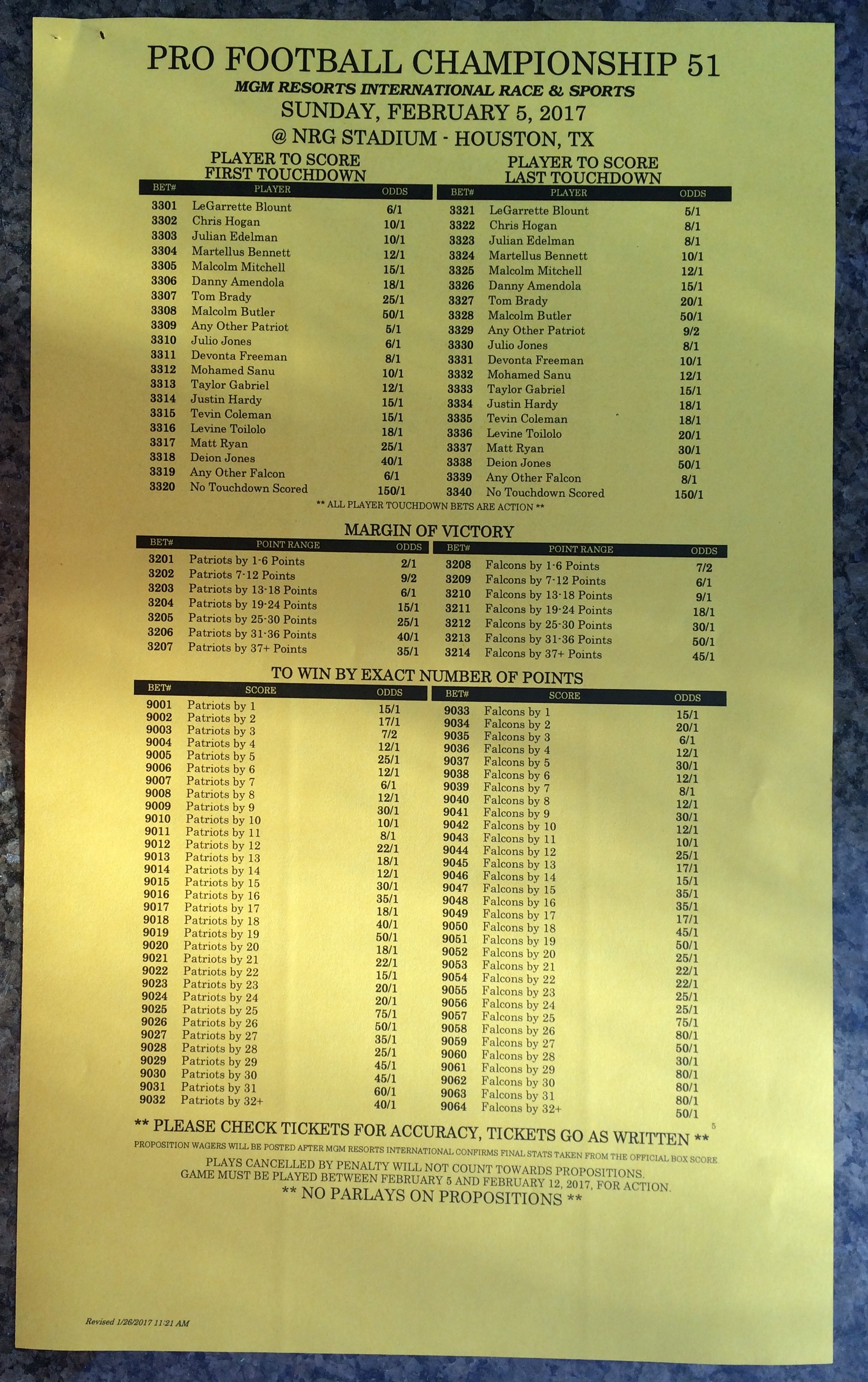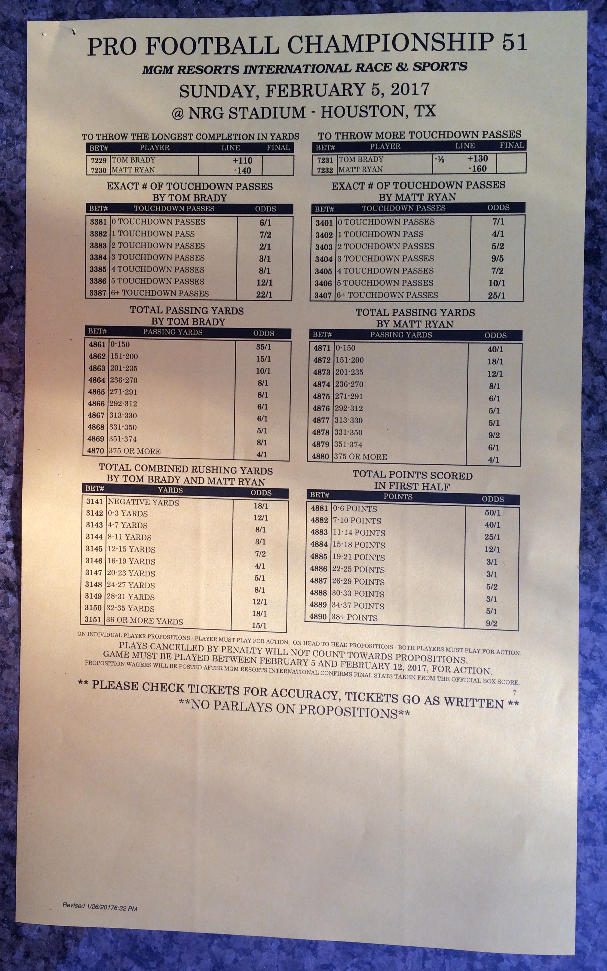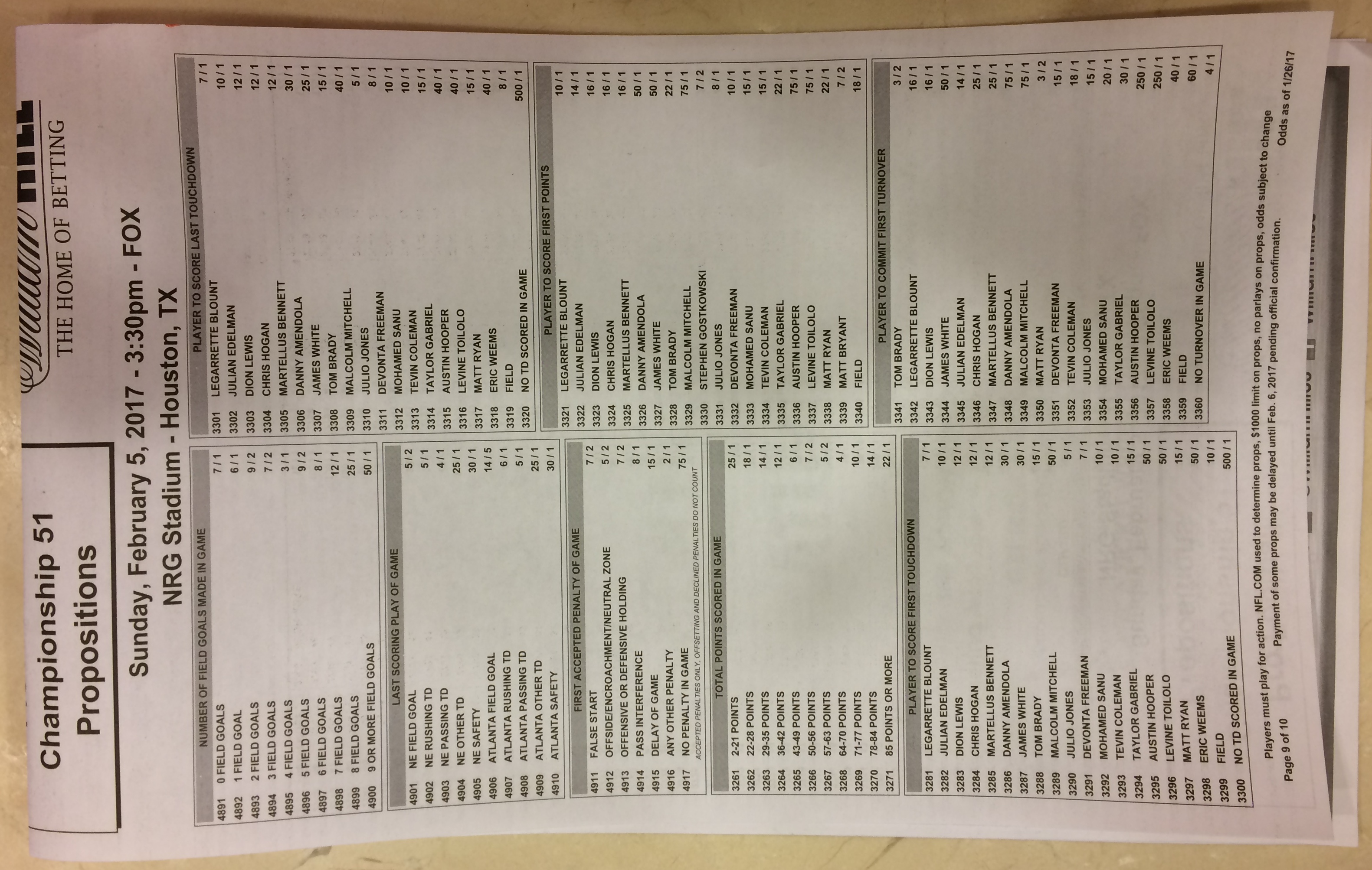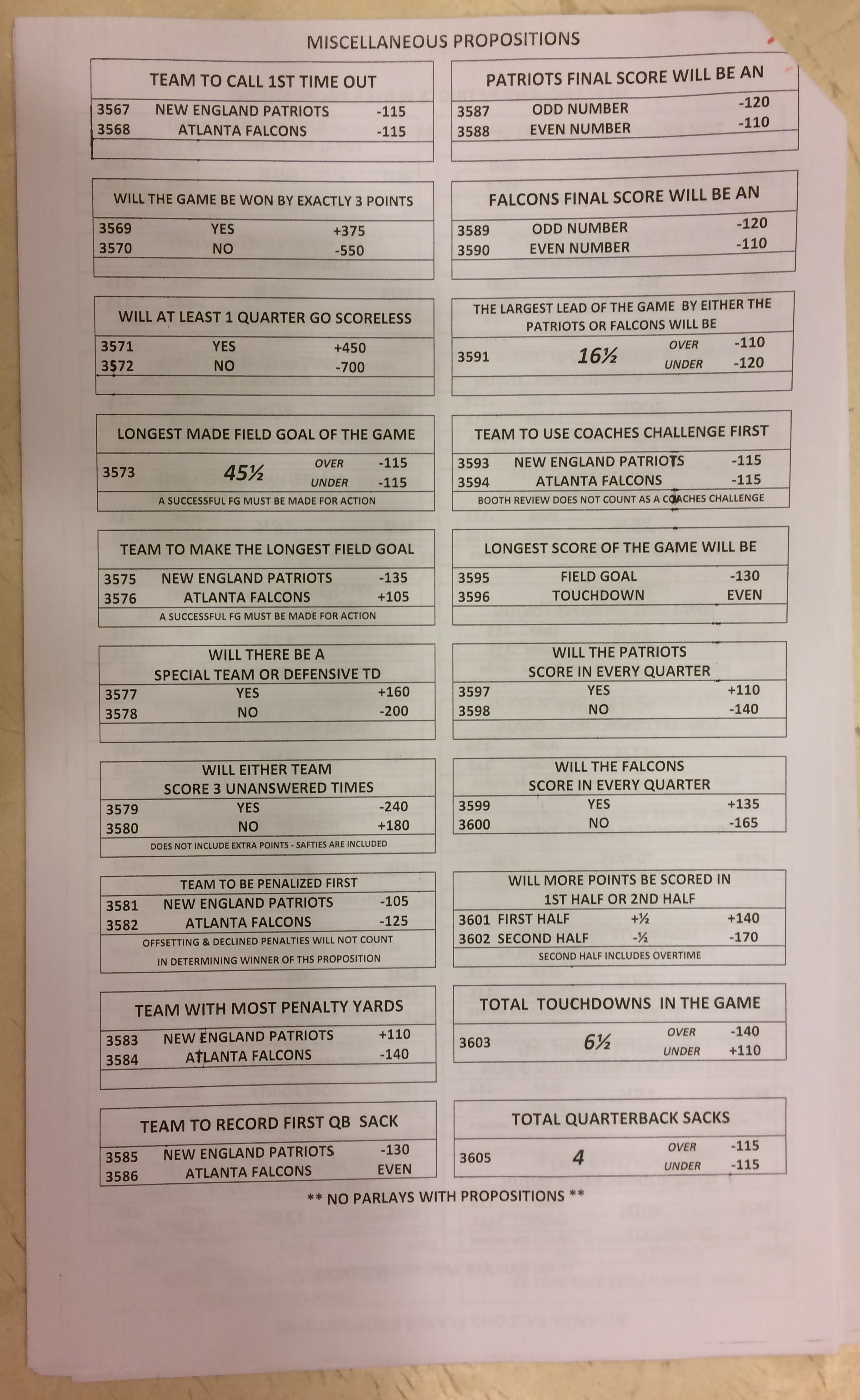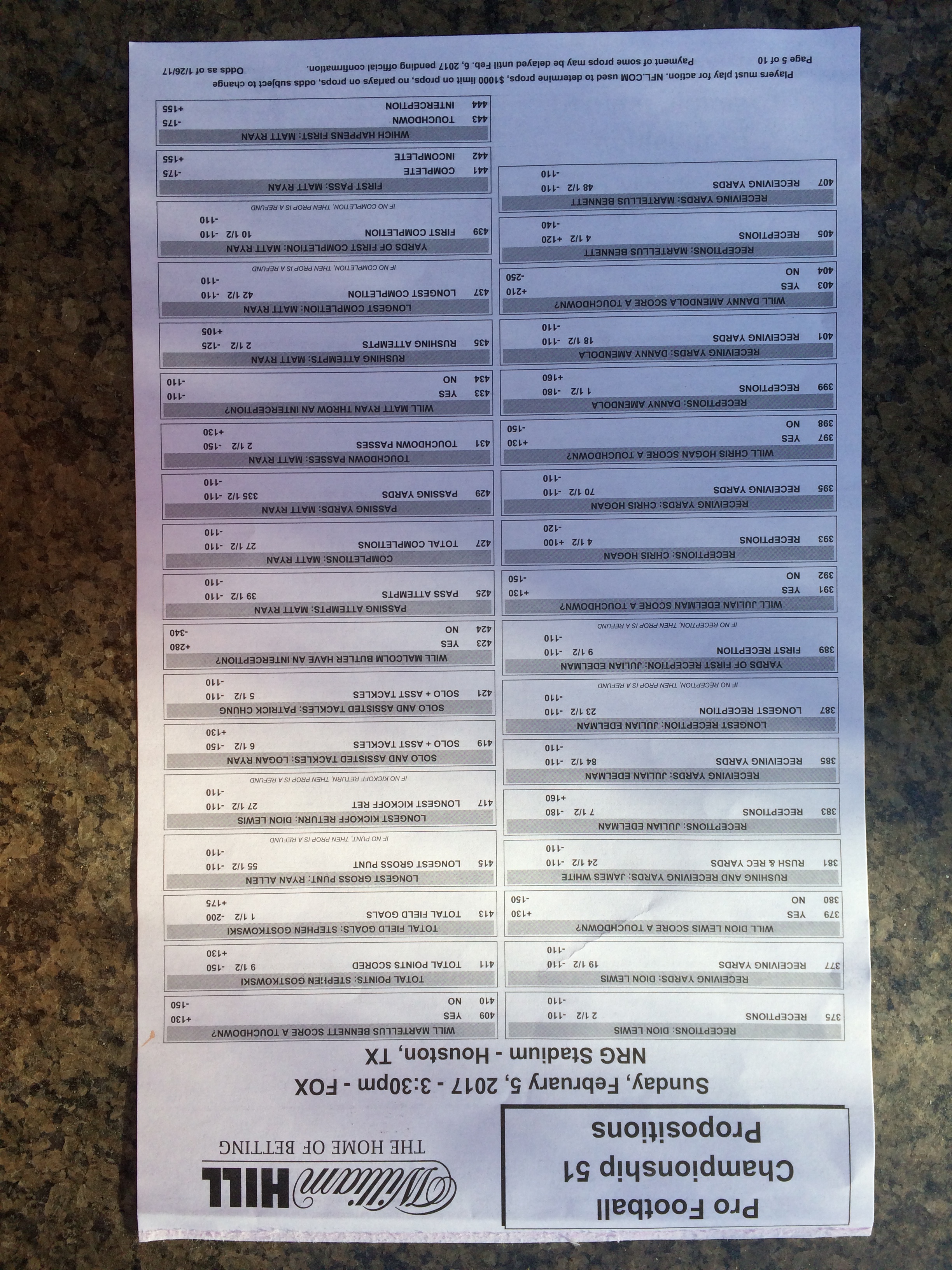 Embora eu não vá dar nenhum palpite este ano, você pode pelo menos ver o que está disponível. Aqui estão algumas imagens de planilhas de apostas para o Super Bowl 51. Mais devem aparecer nos dias que antecedem o jogo.