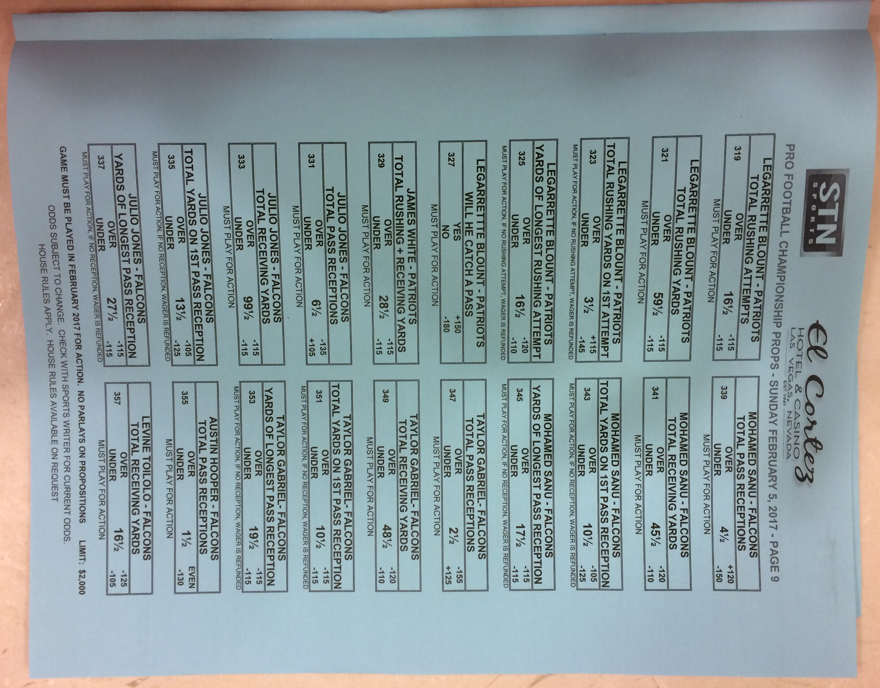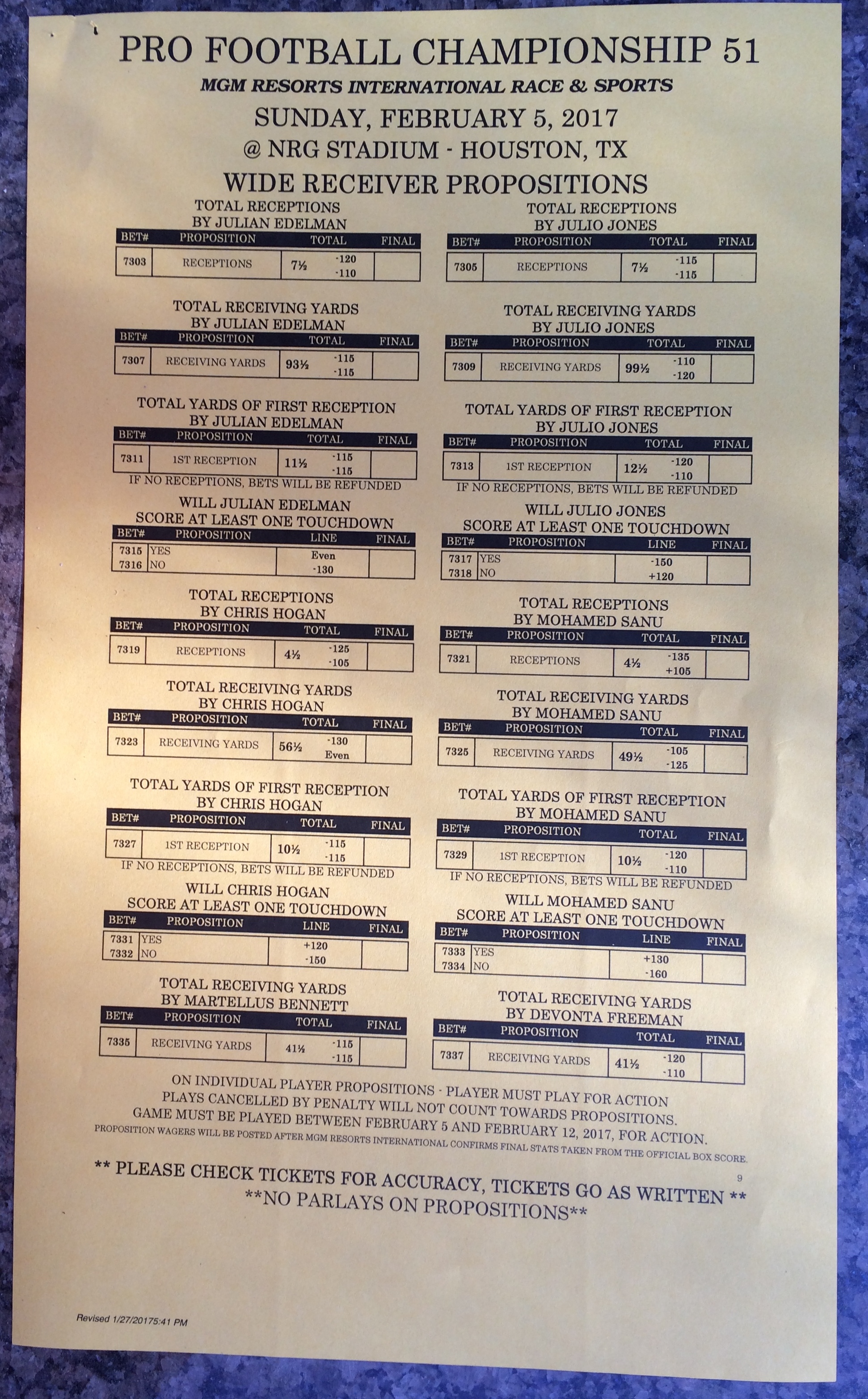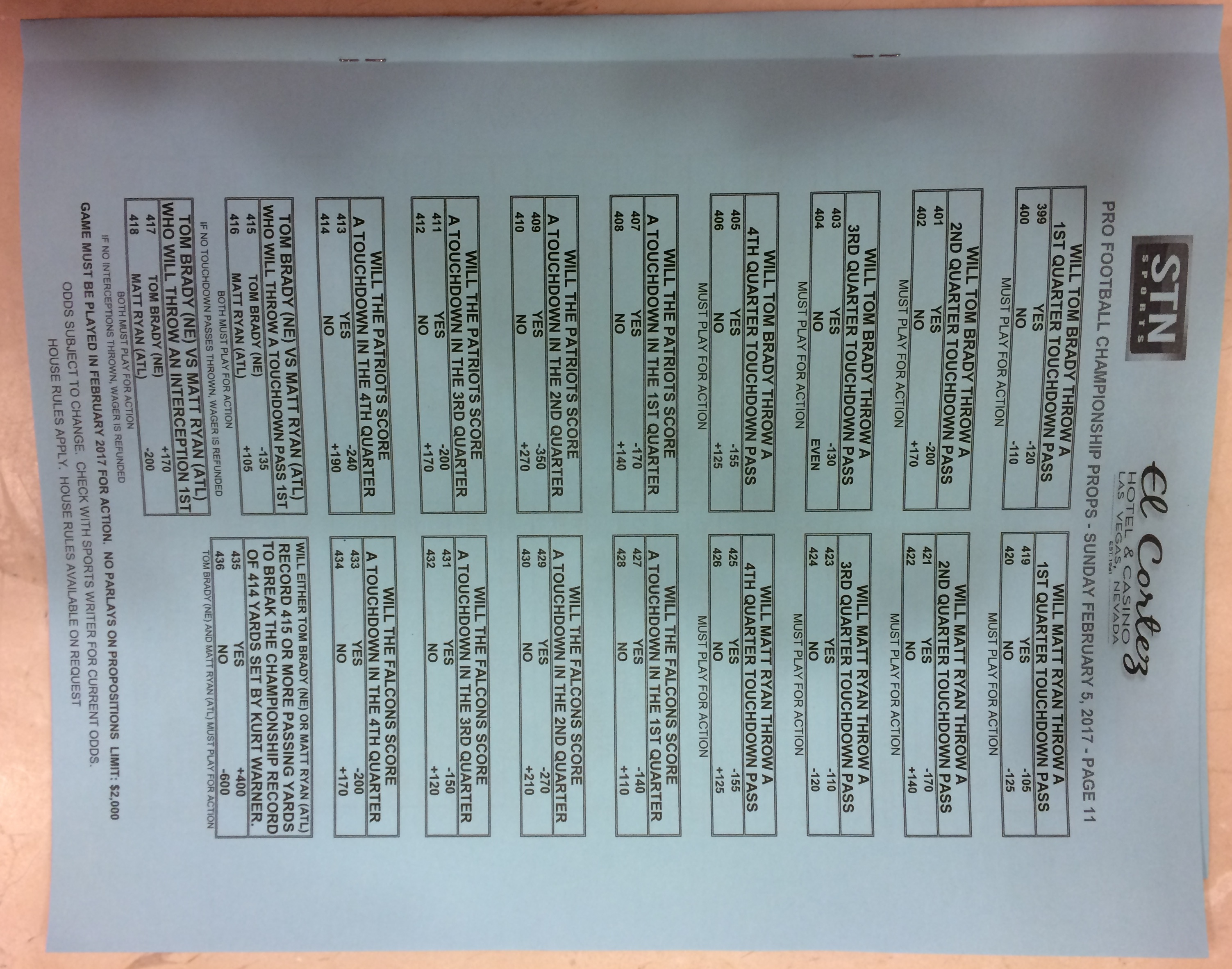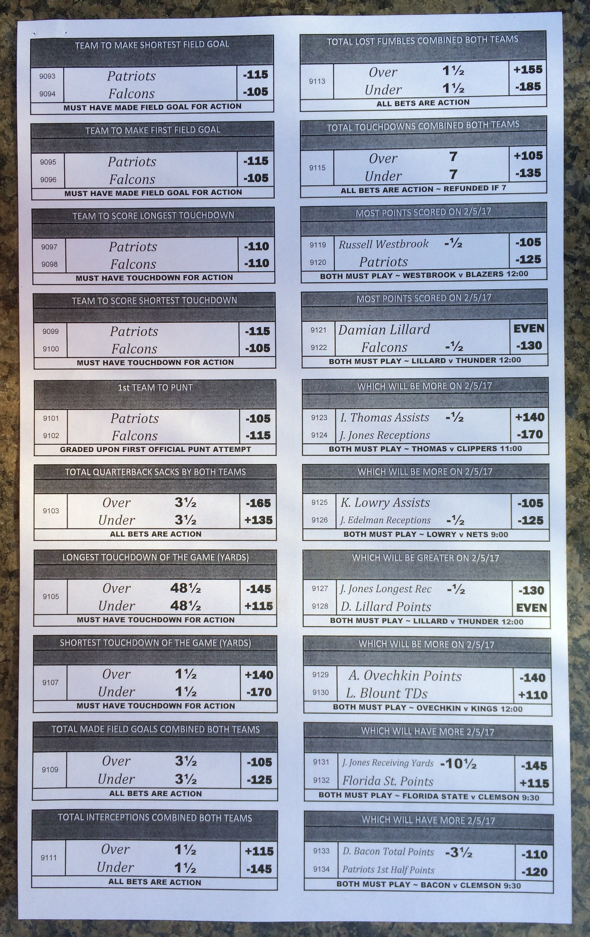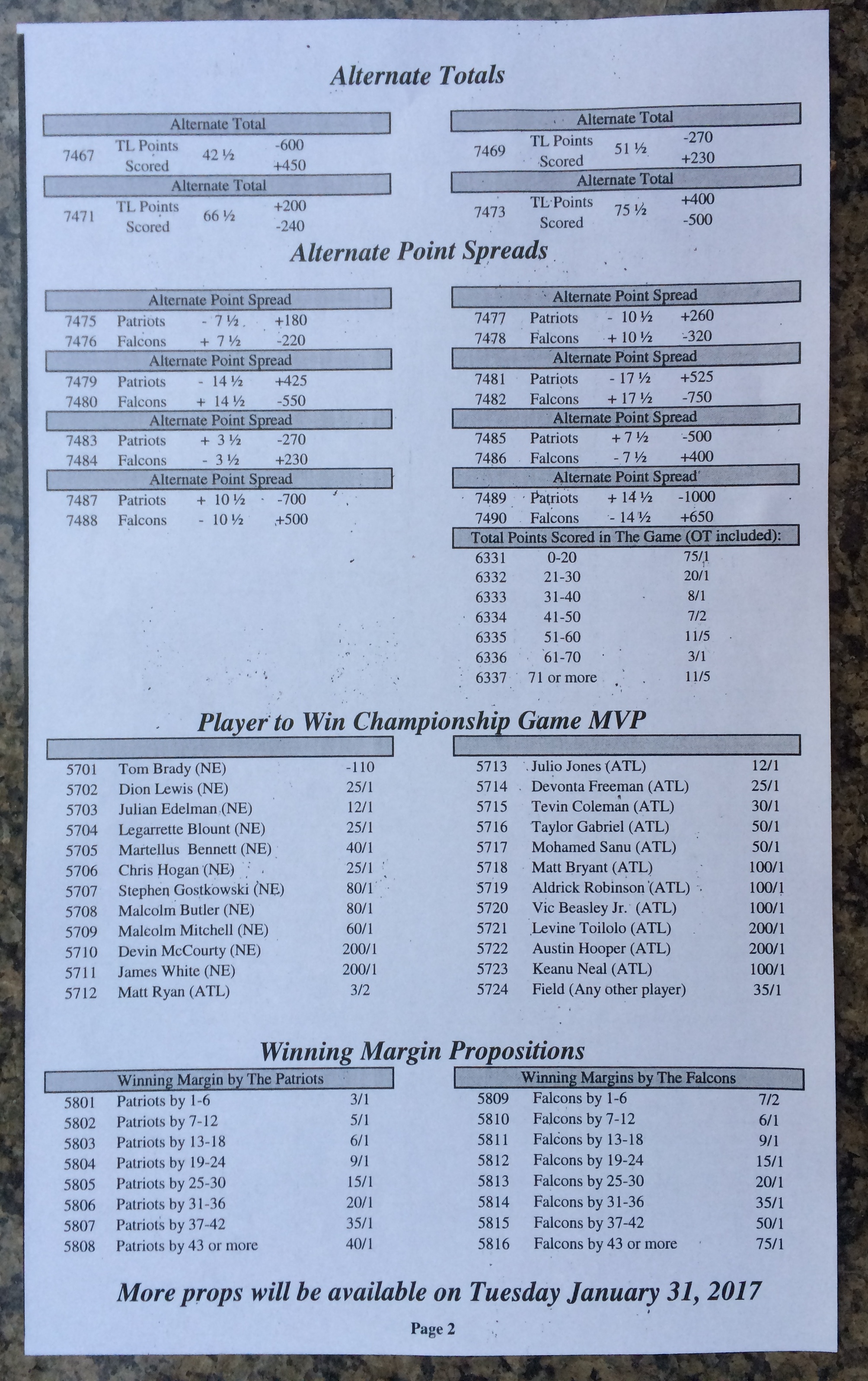 Embora eu não vá dar nenhum palpite este ano, você pode pelo menos ver o que está disponível. Aqui estão algumas imagens de planilhas de apostas para o Super Bowl 51. Mais devem aparecer nos dias que antecedem o jogo.