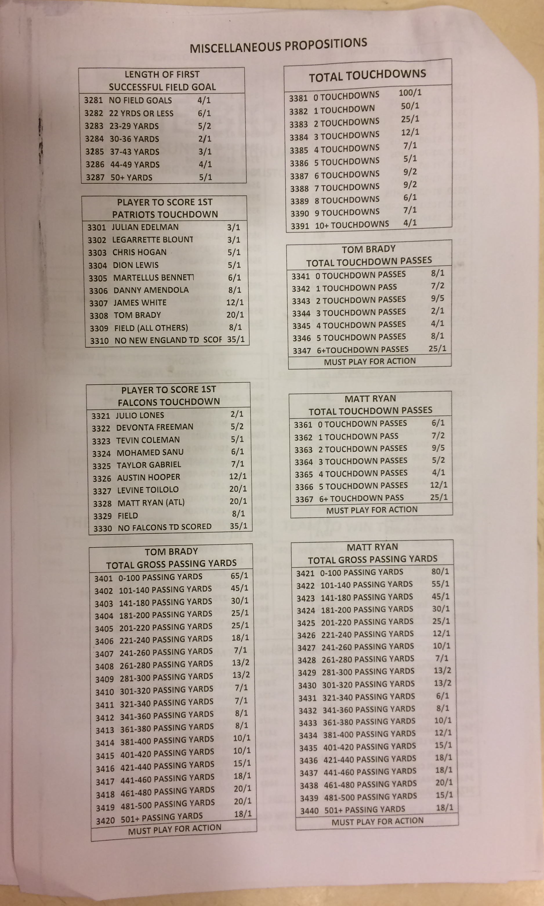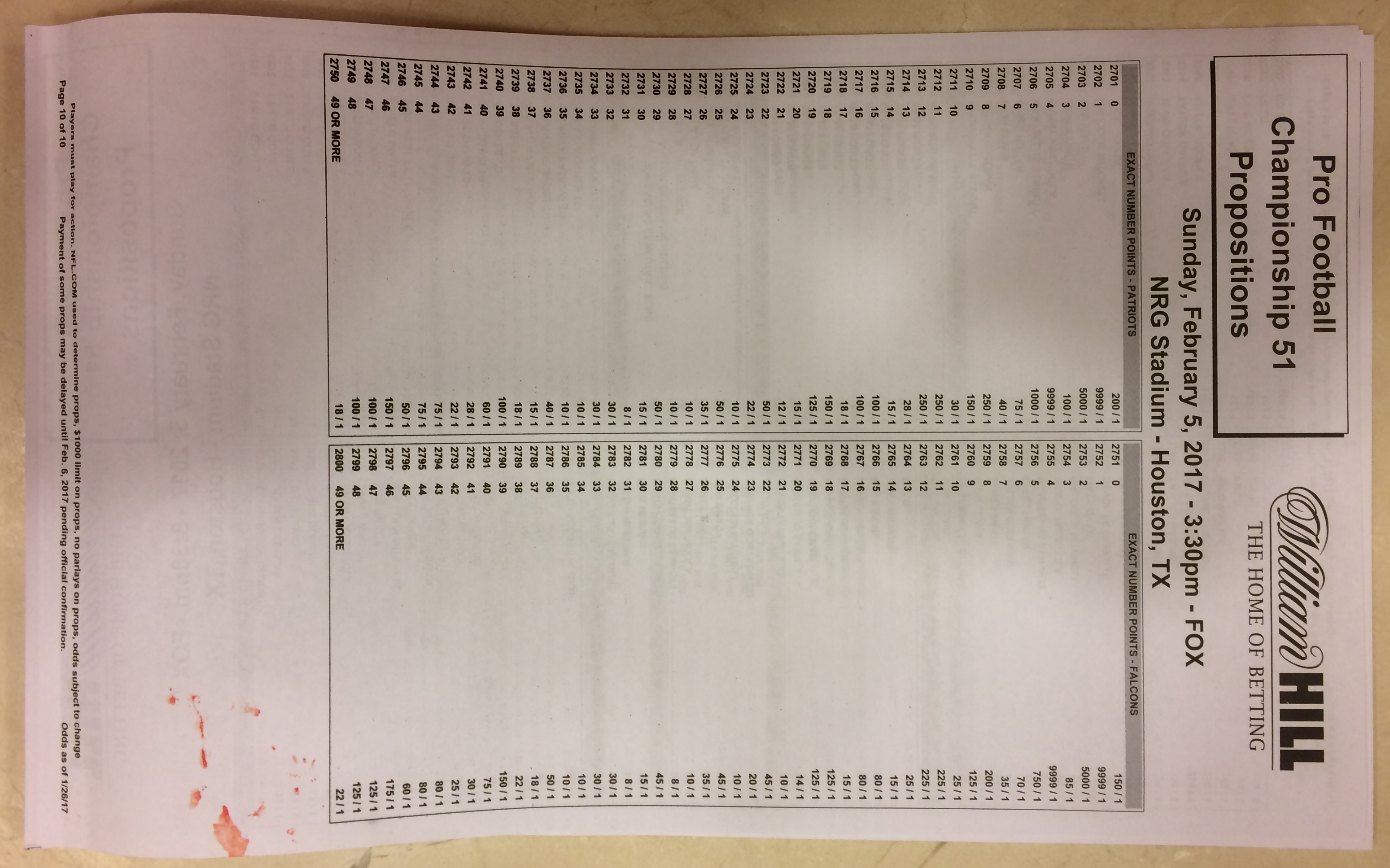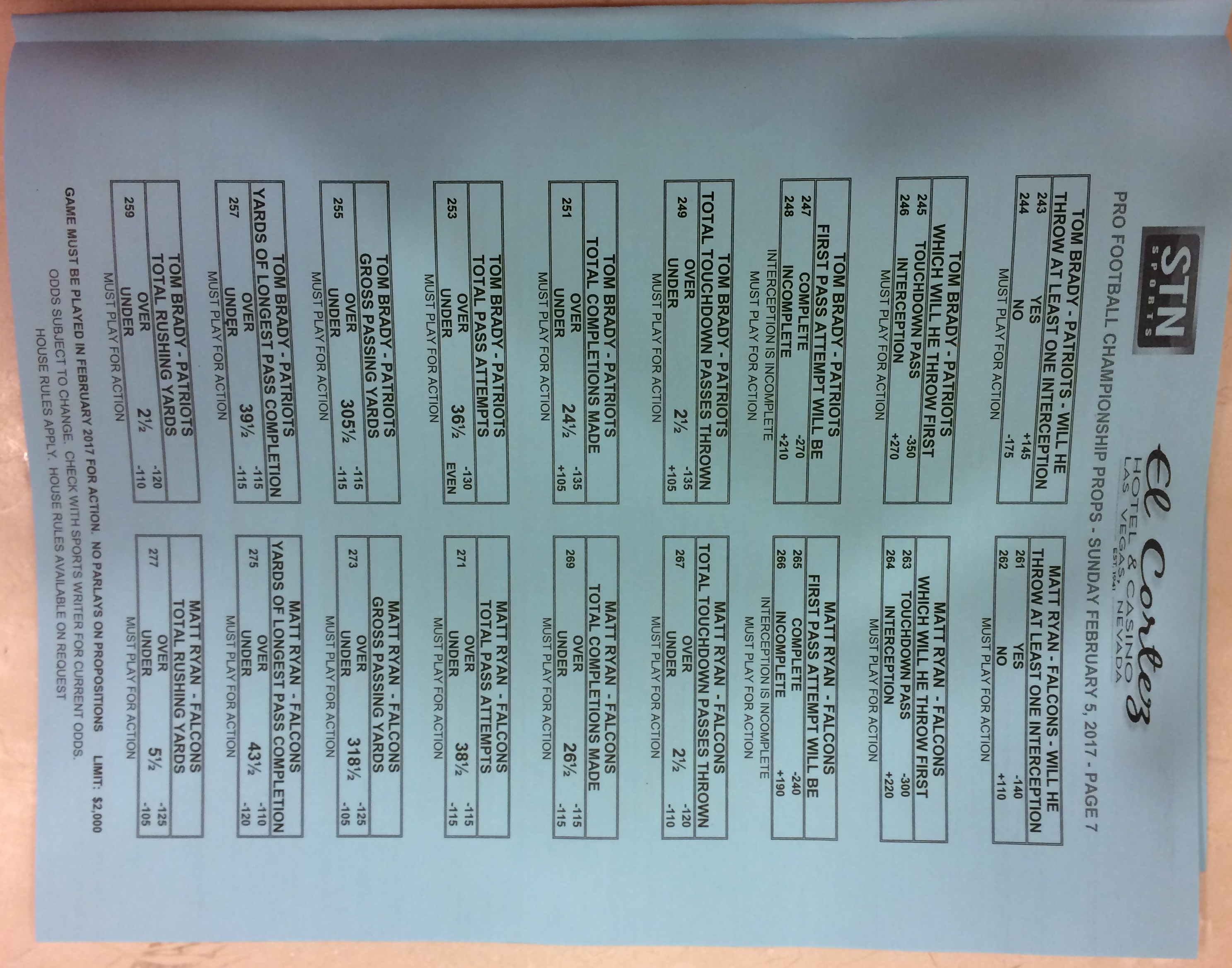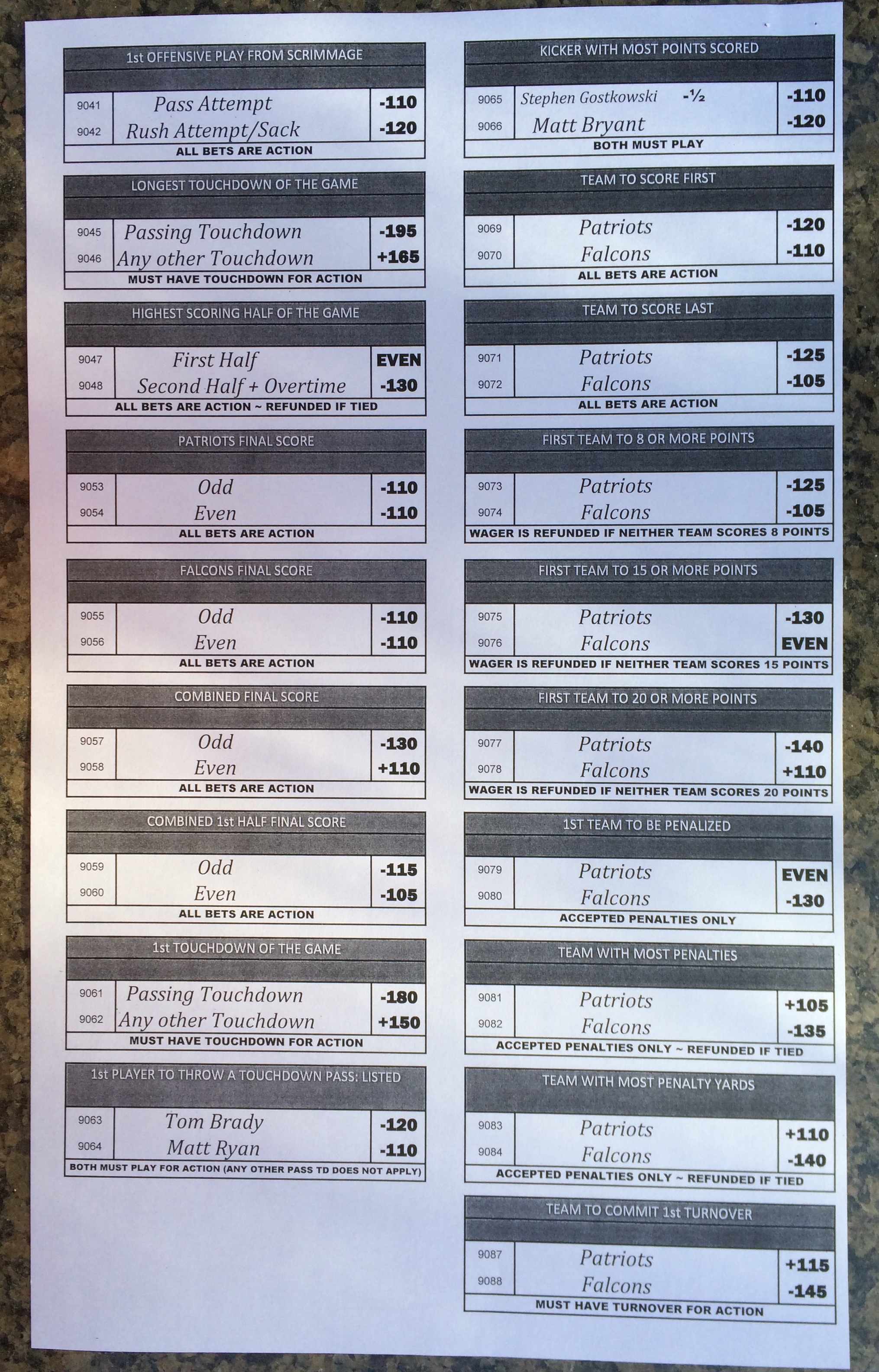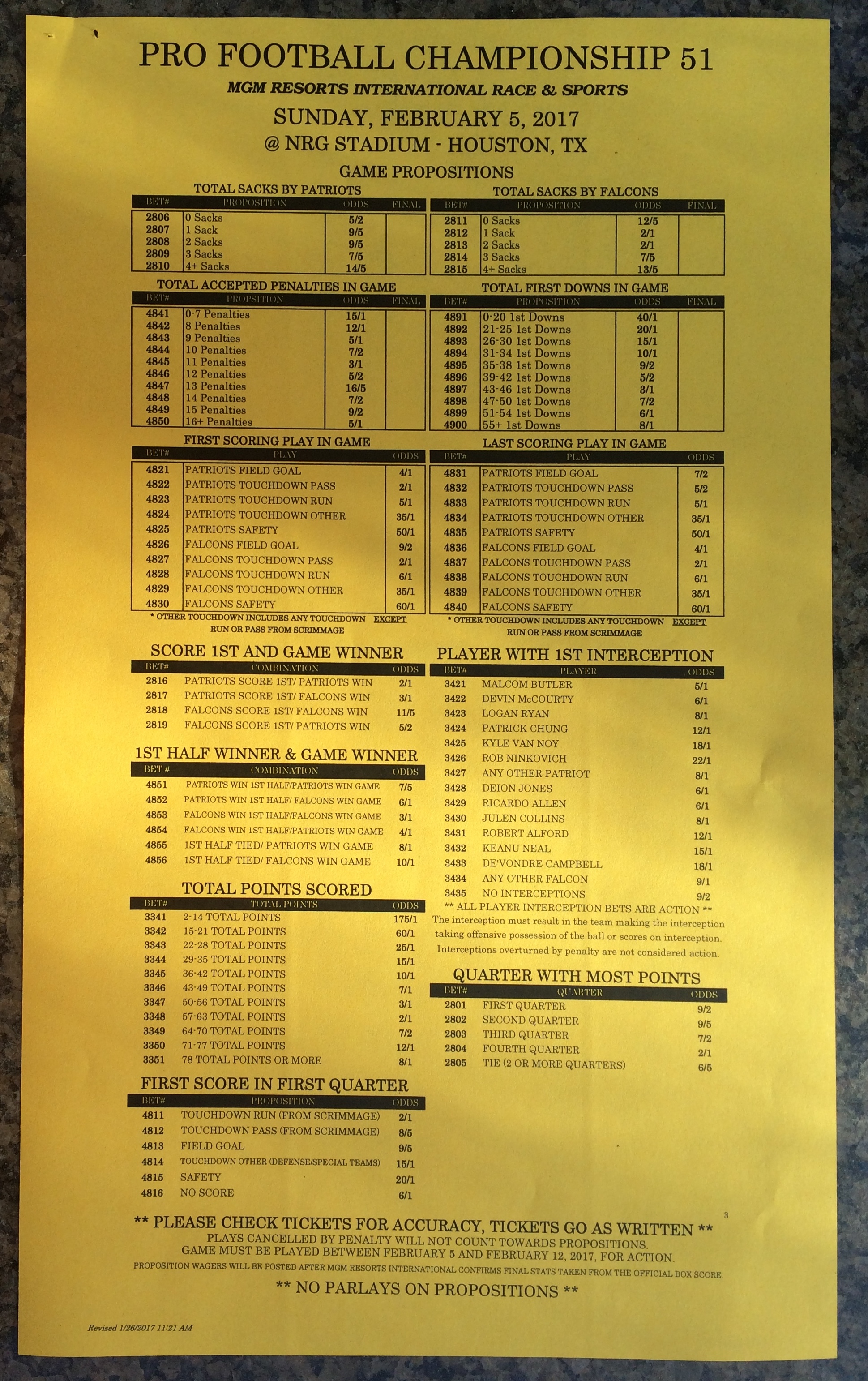 Embora eu não vá dar nenhum palpite este ano, você pode pelo menos ver o que está disponível. Aqui estão algumas imagens de planilhas de apostas para o Super Bowl 51. Mais devem aparecer nos dias que antecedem o jogo.