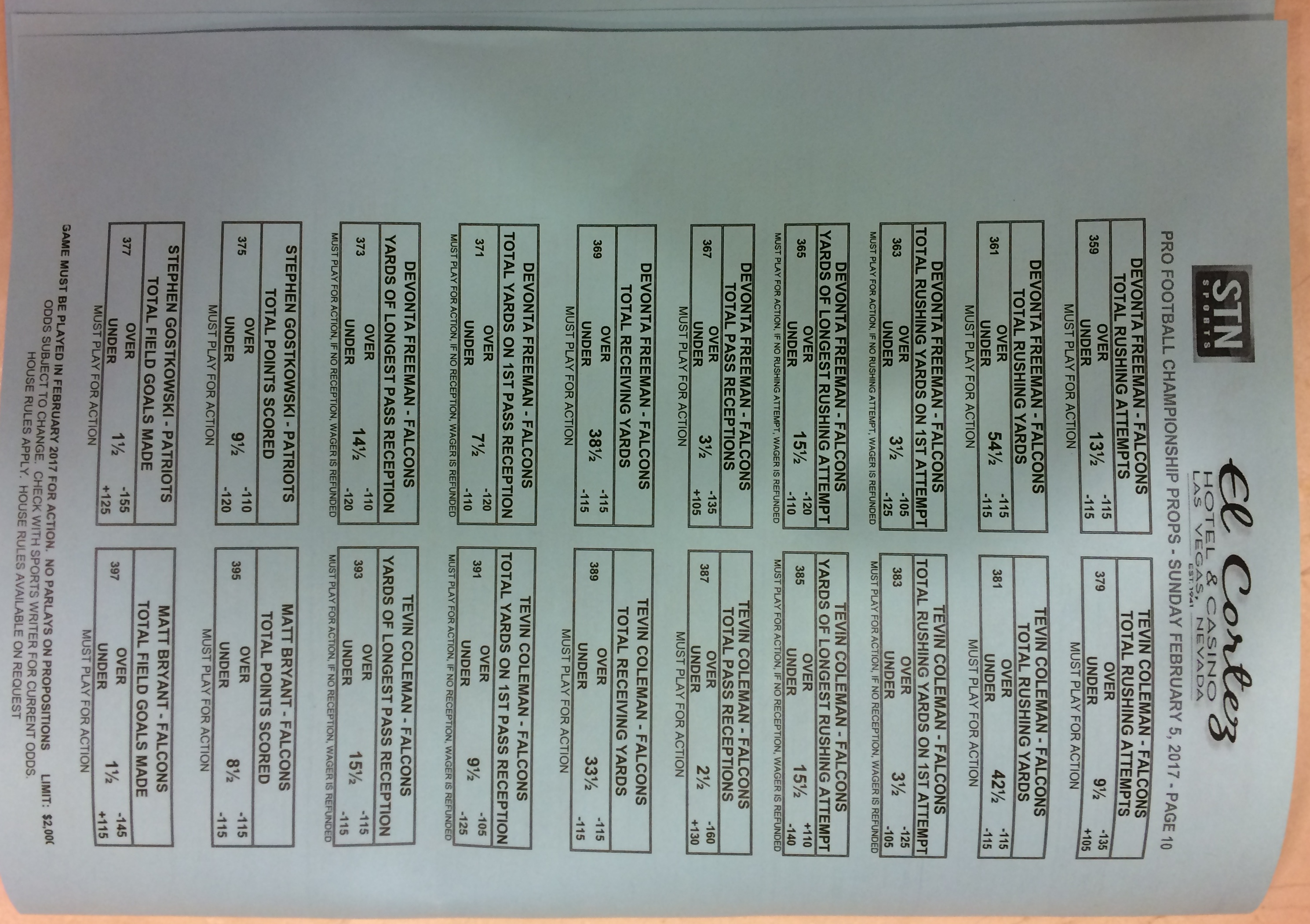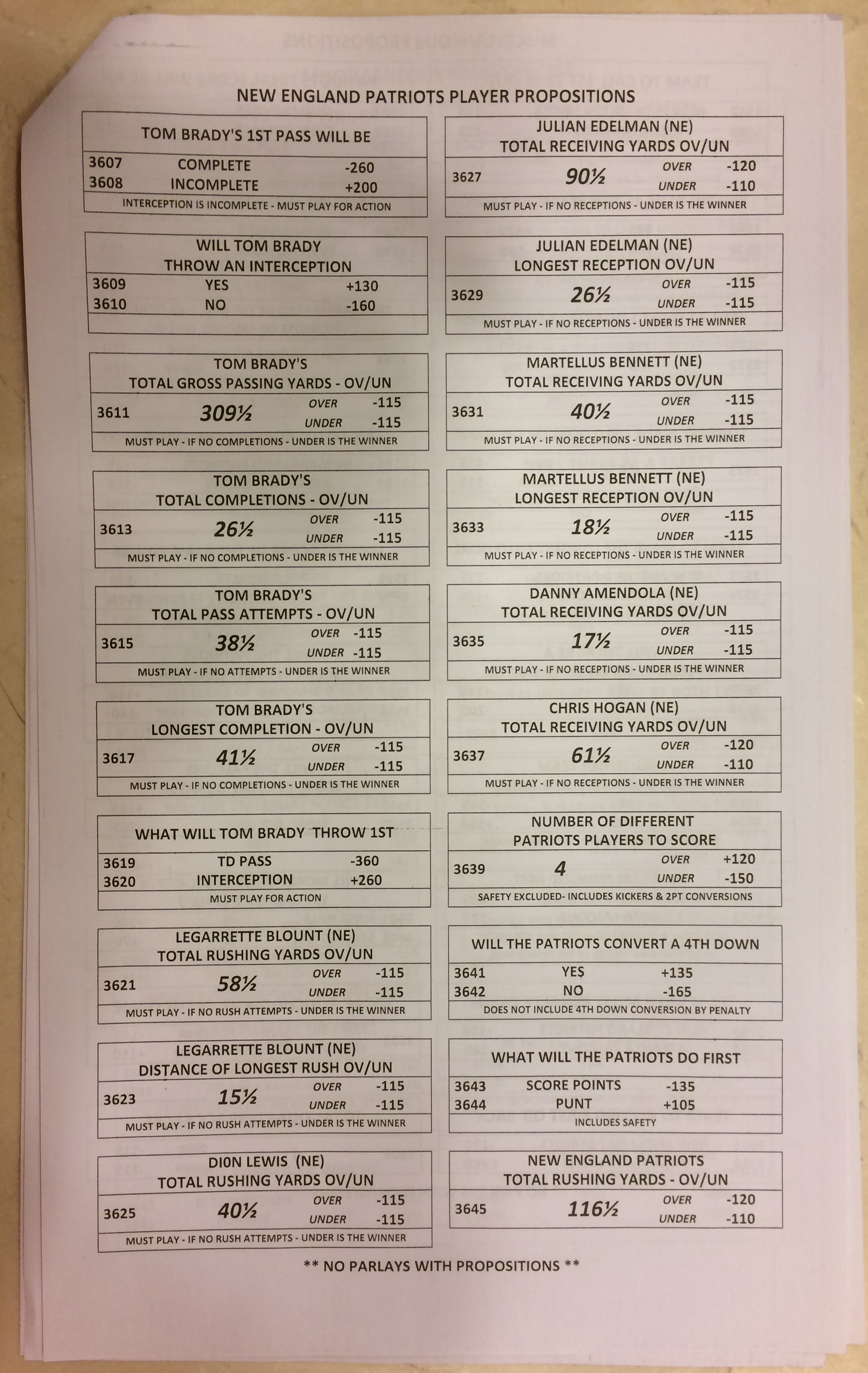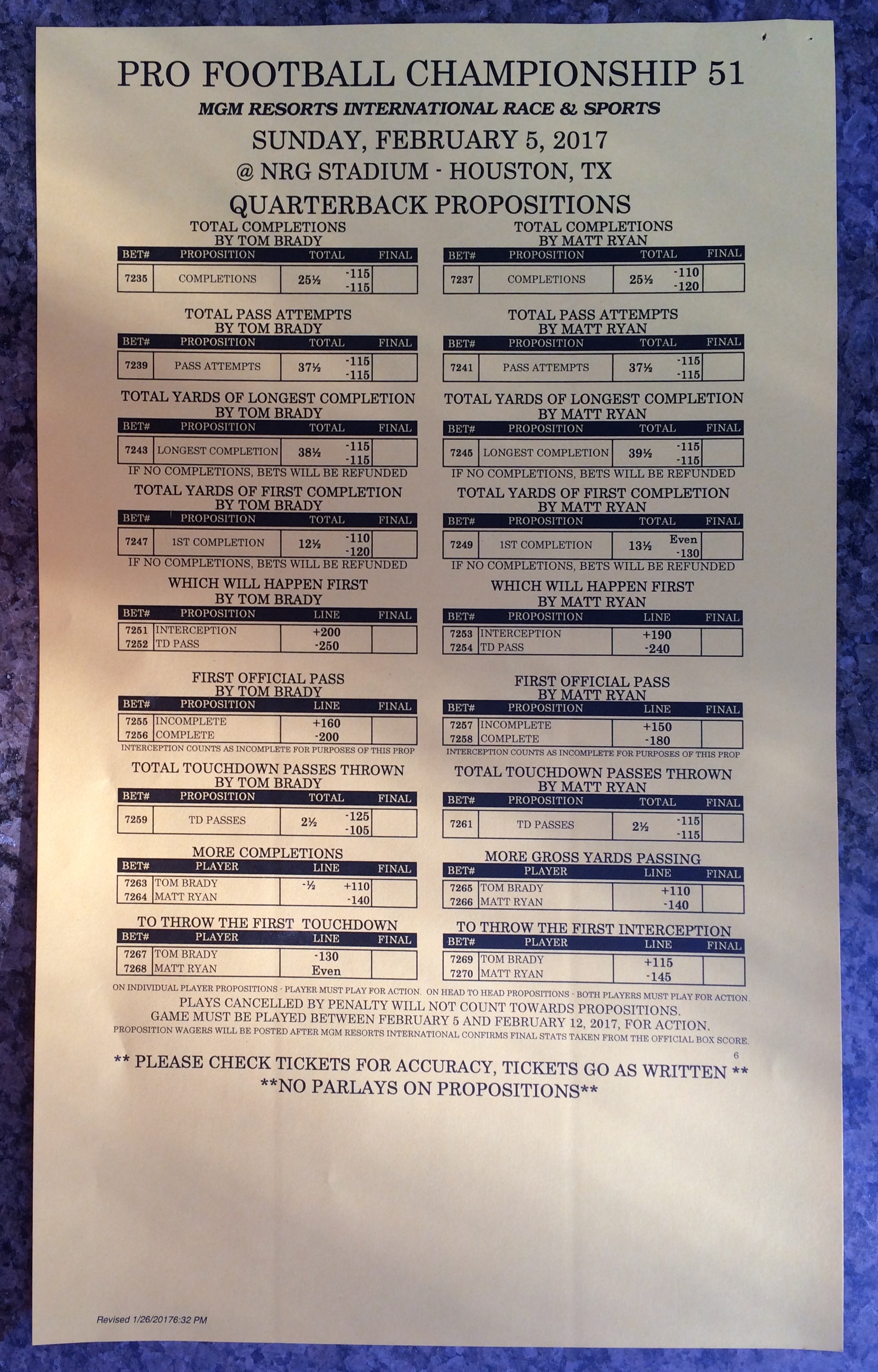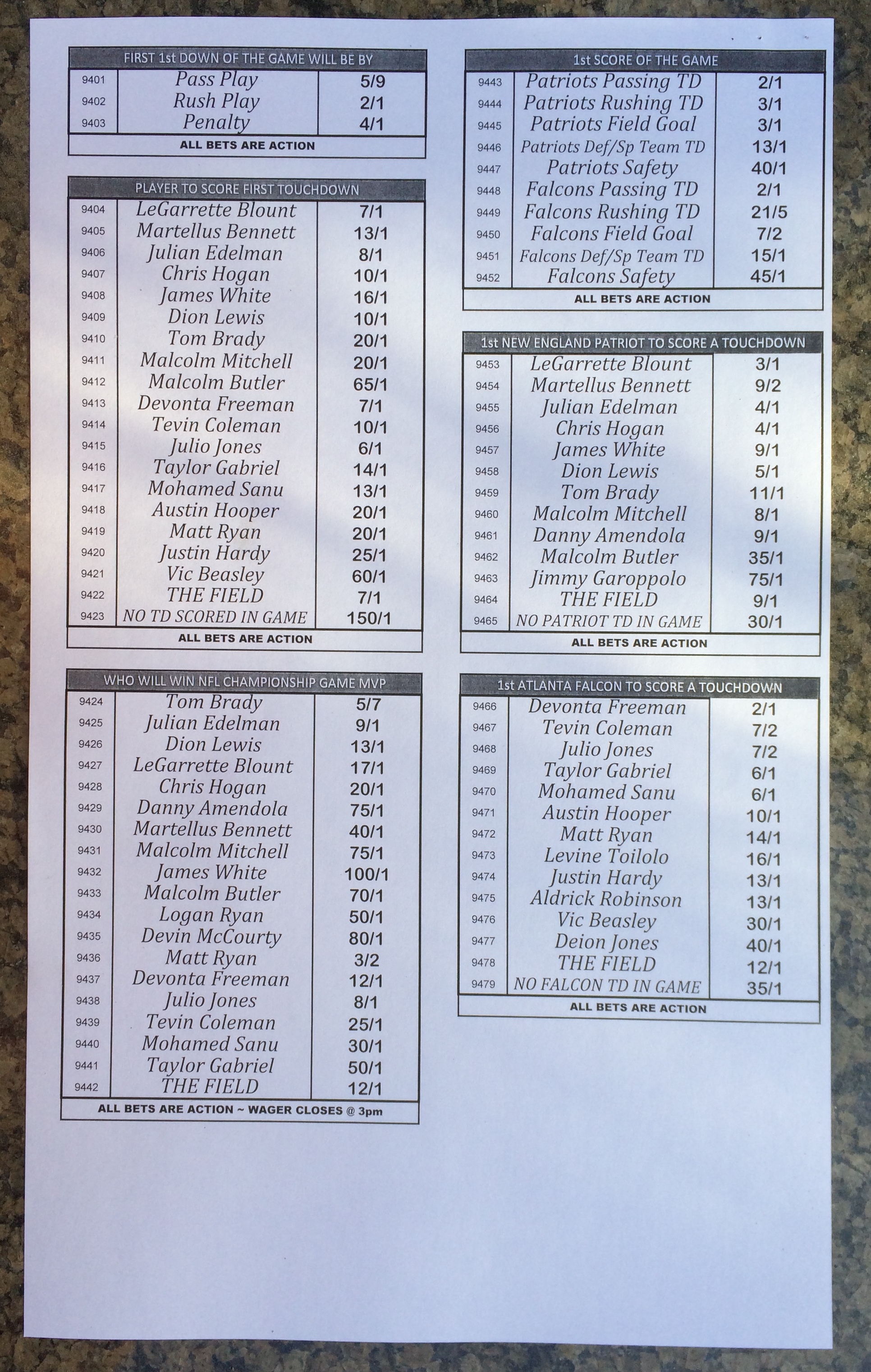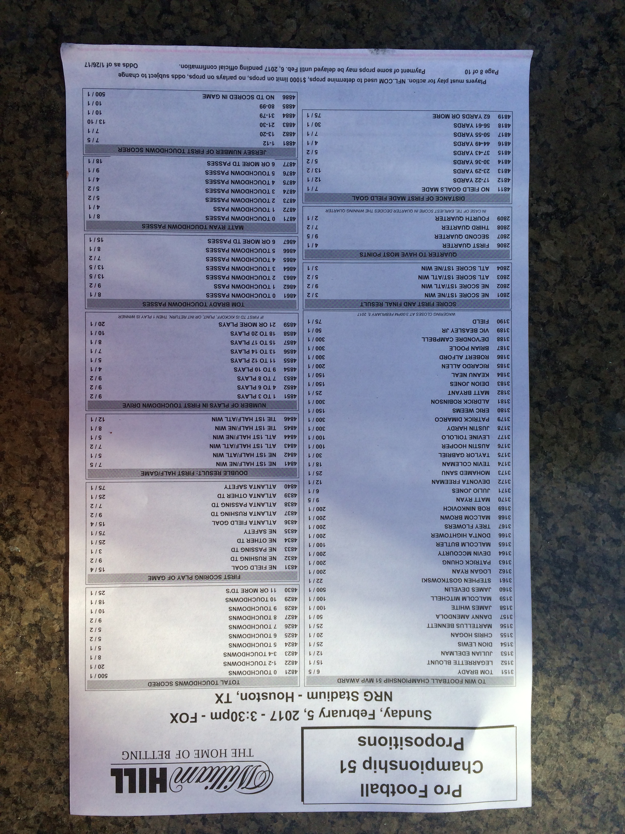 Embora eu não vá dar nenhum palpite este ano, você pode pelo menos ver o que está disponível. Aqui estão algumas imagens de planilhas de apostas para o Super Bowl 51. Mais devem aparecer nos dias que antecedem o jogo.