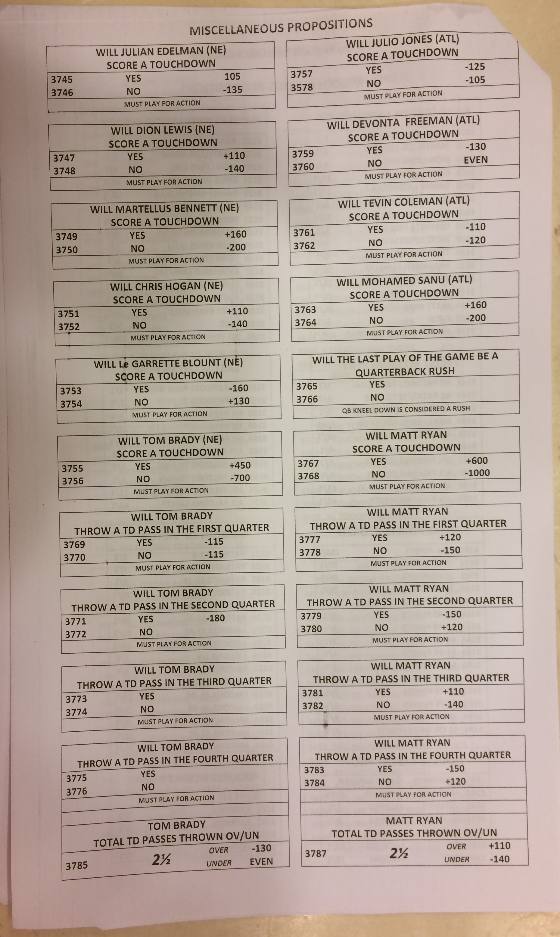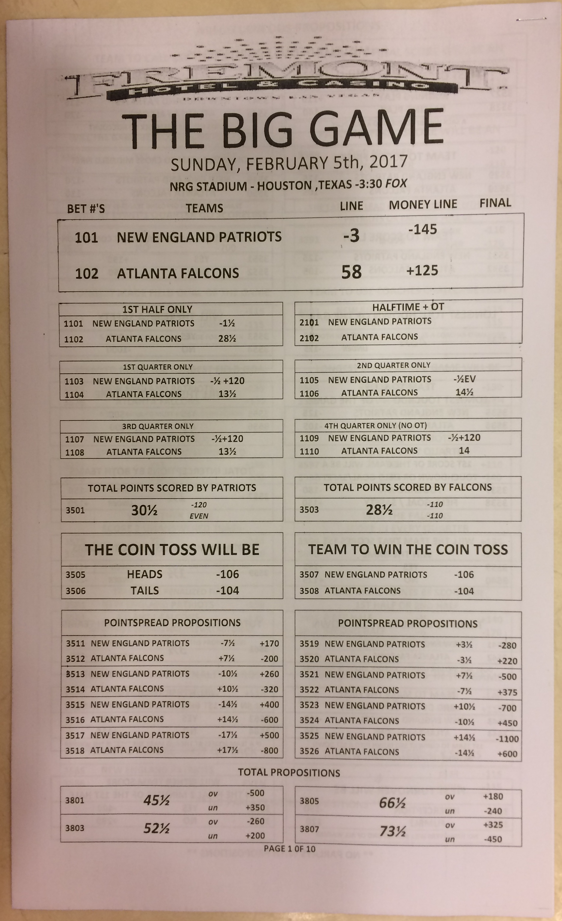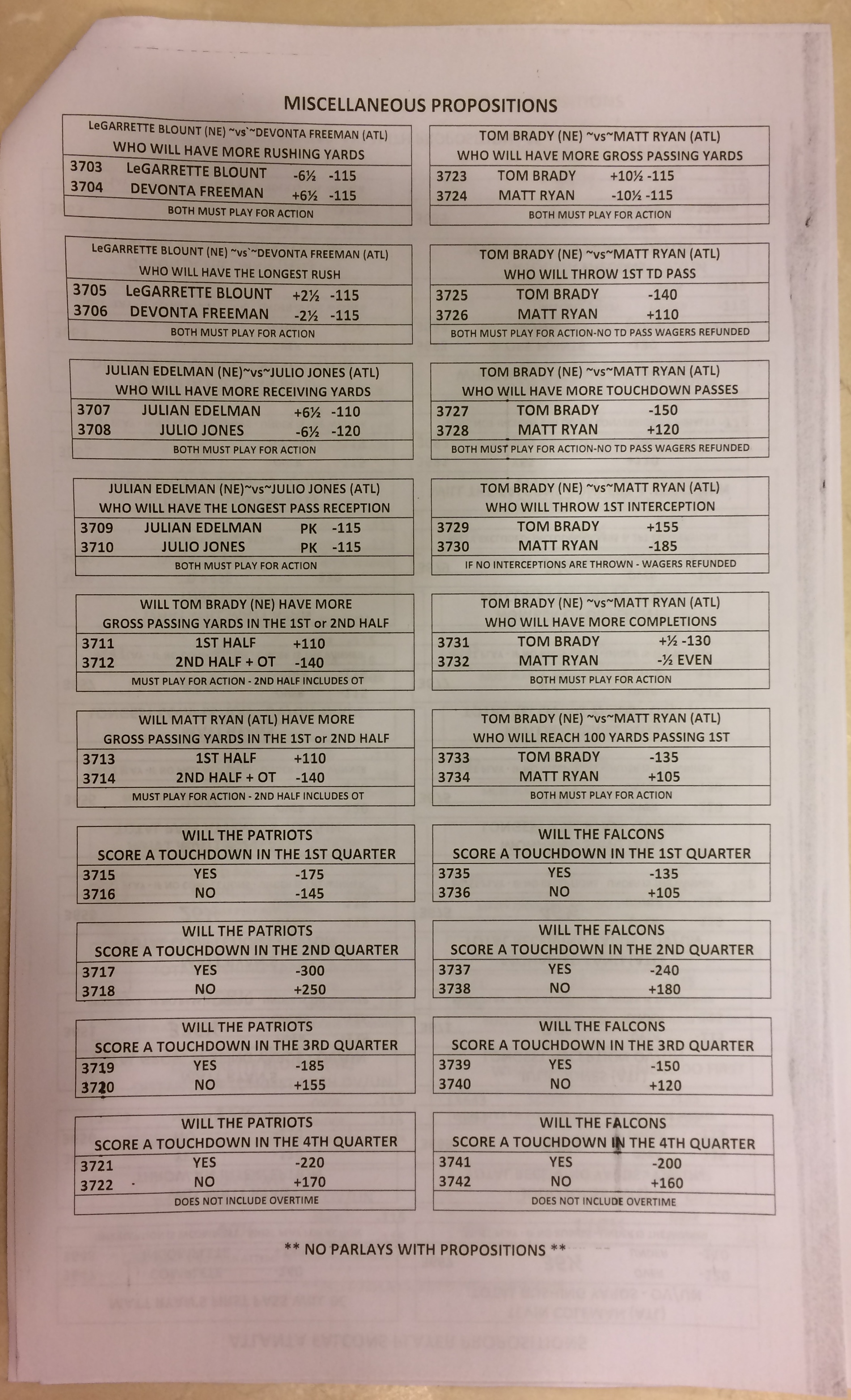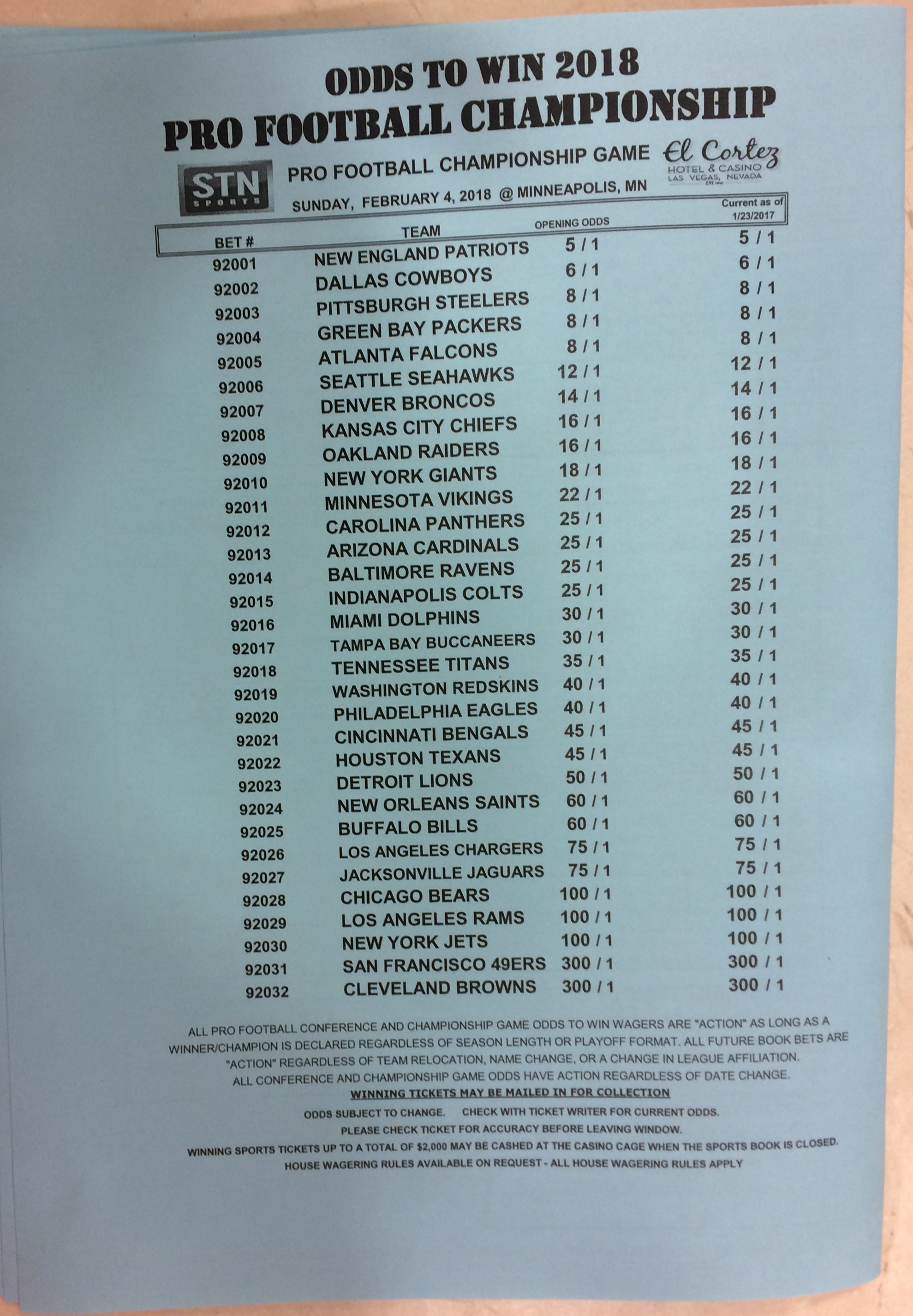 Embora eu não vá dar nenhum palpite este ano, você pode pelo menos ver o que está disponível. Aqui estão algumas imagens de planilhas de apostas para o Super Bowl 51. Mais devem aparecer nos dias que antecedem o jogo.