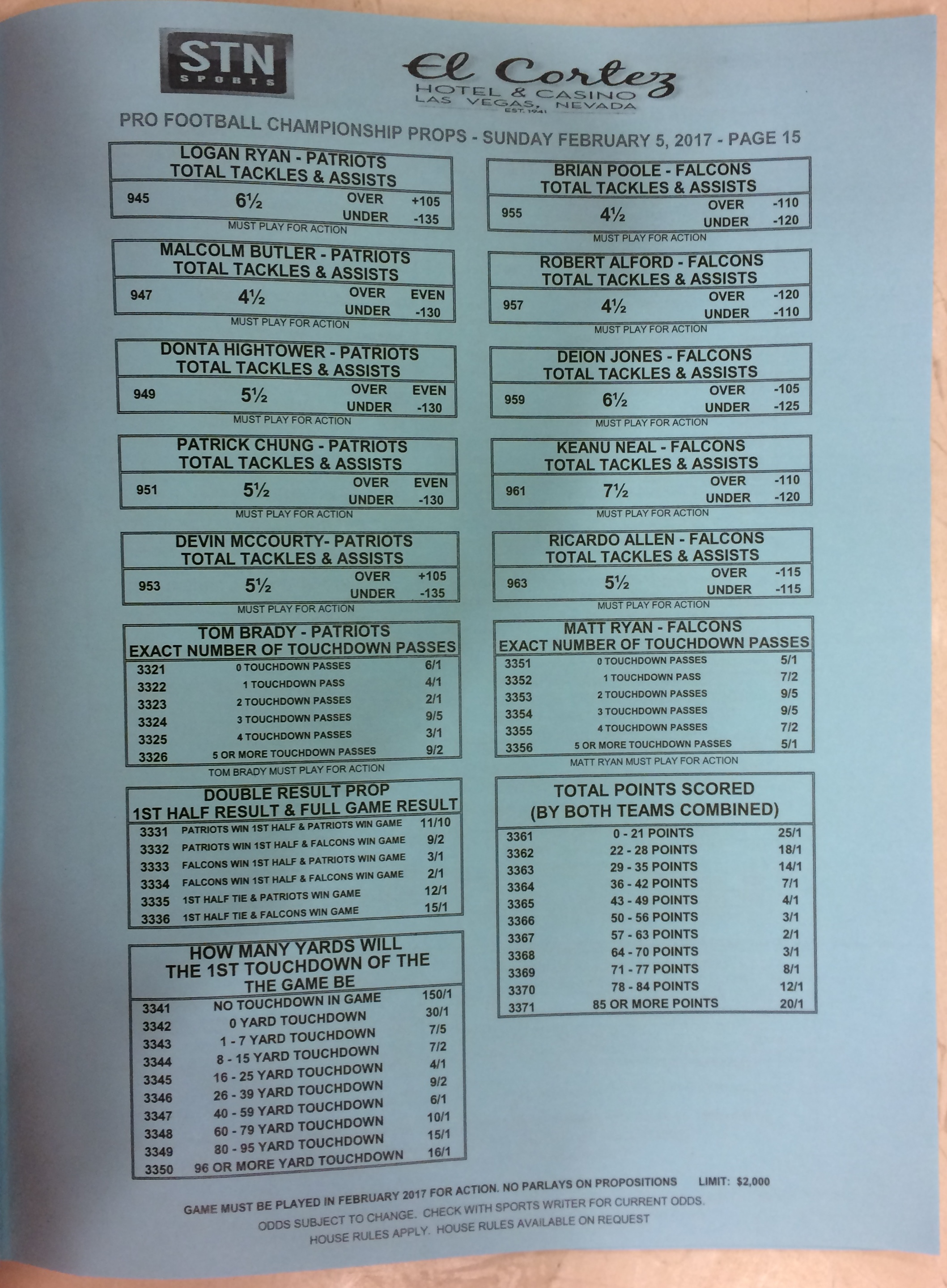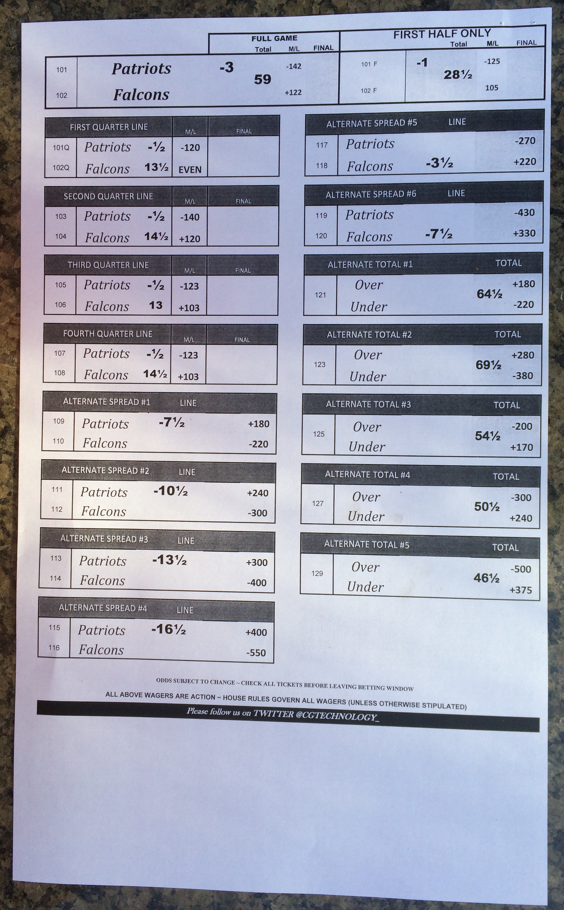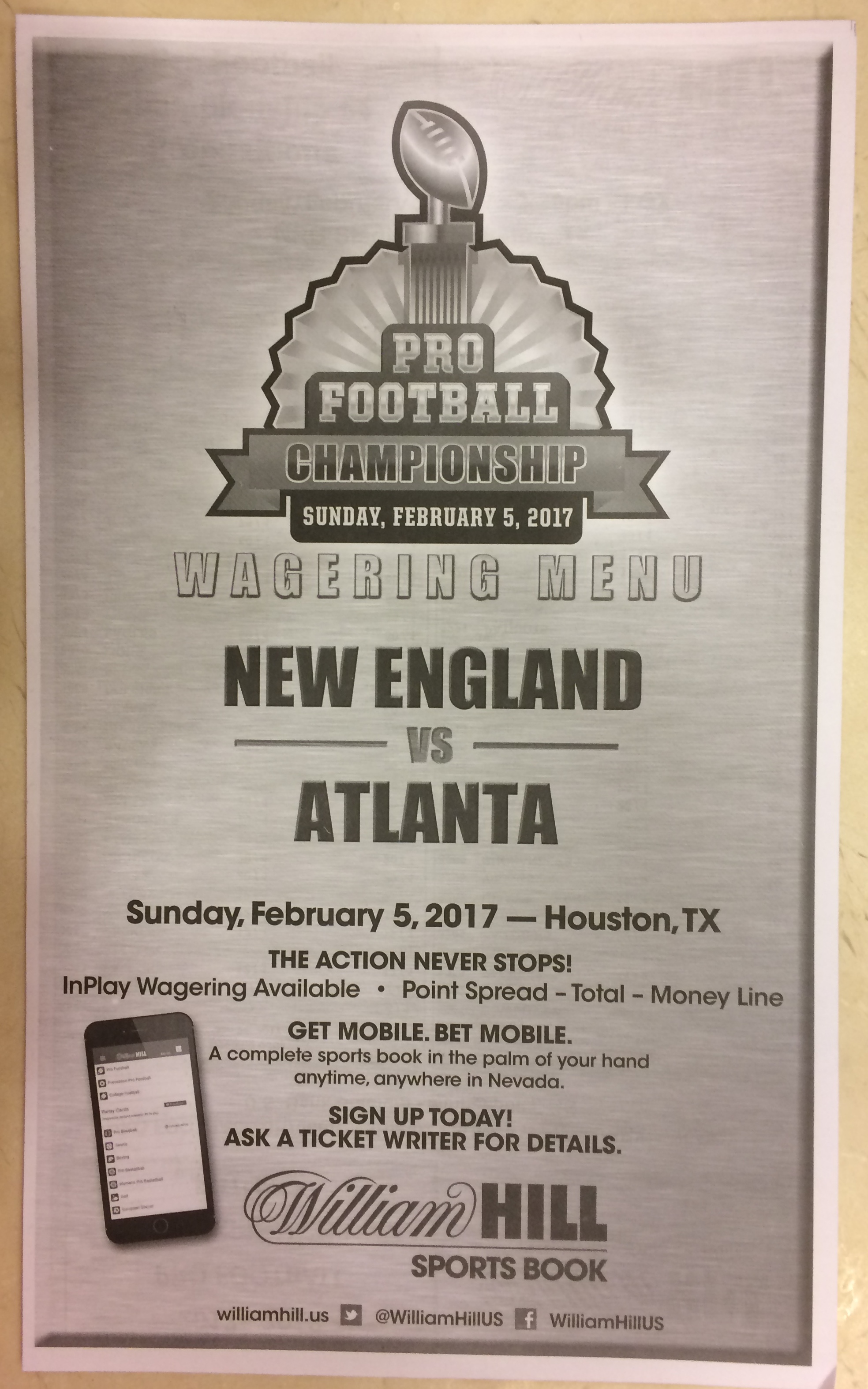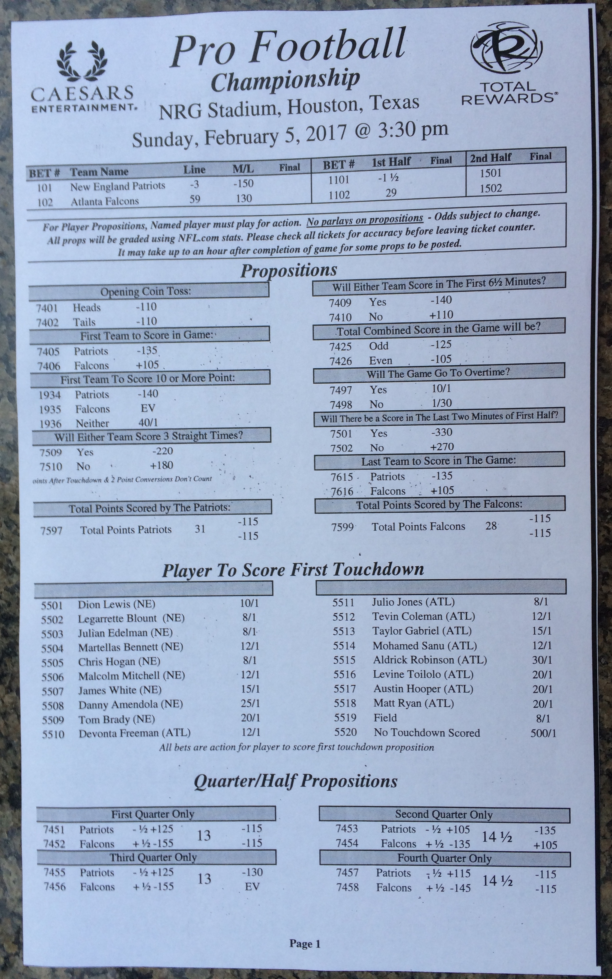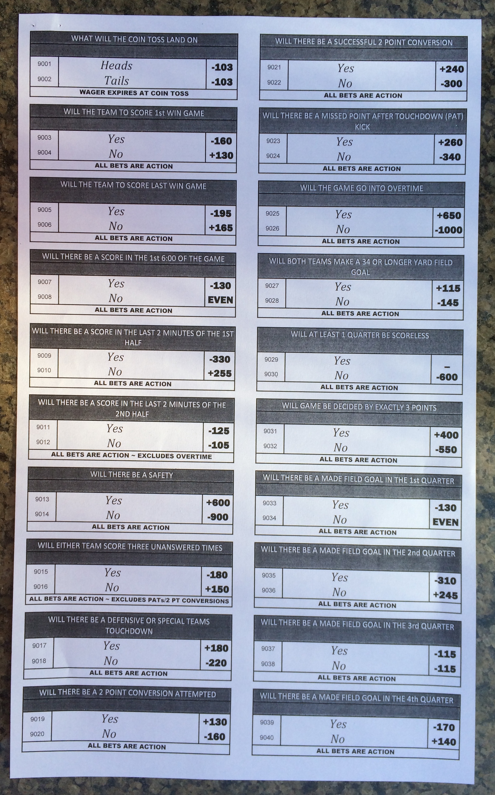 Embora eu não vá dar nenhum palpite este ano, você pode pelo menos ver o que está disponível. Aqui estão algumas imagens de planilhas de apostas para o Super Bowl 51. Mais devem aparecer nos dias que antecedem o jogo.