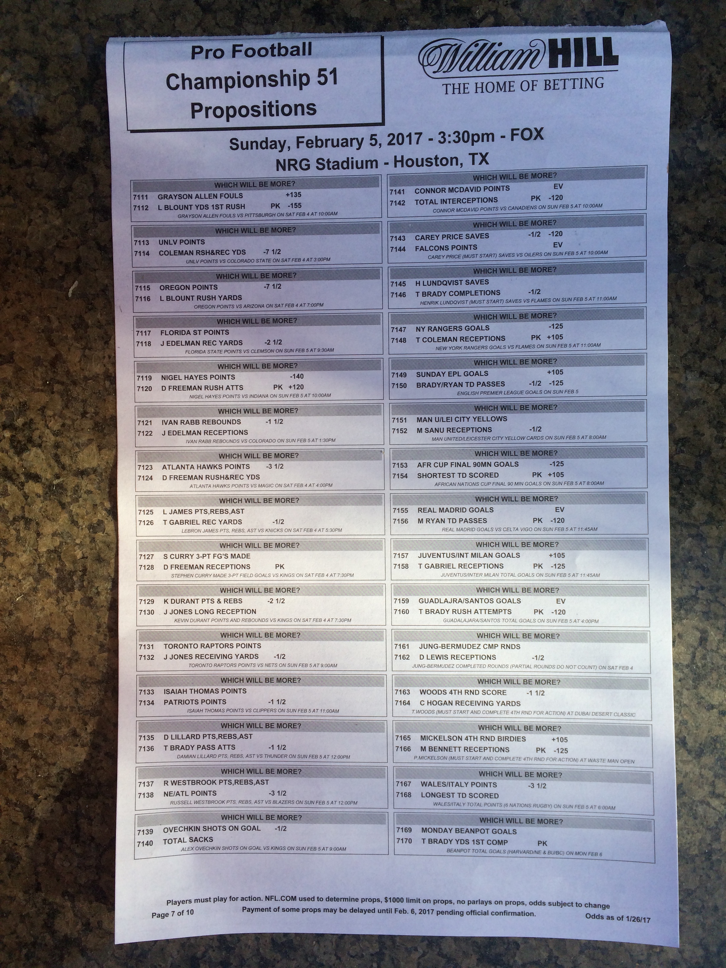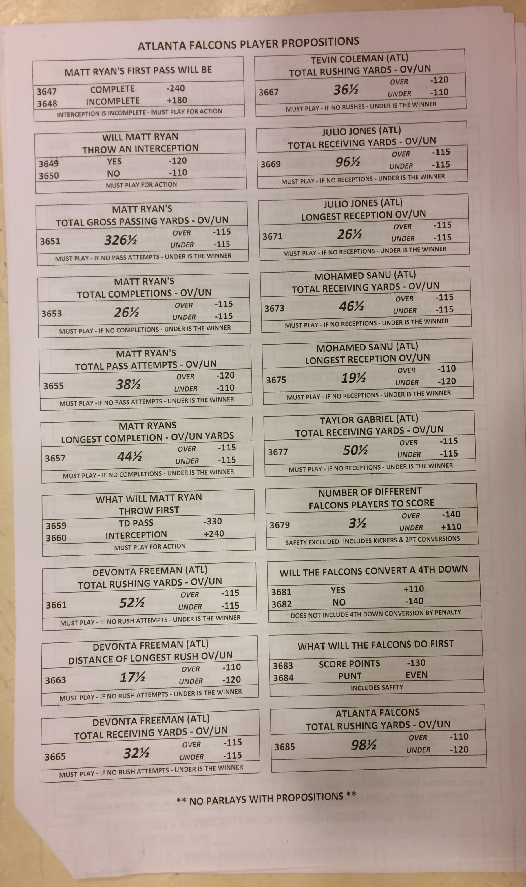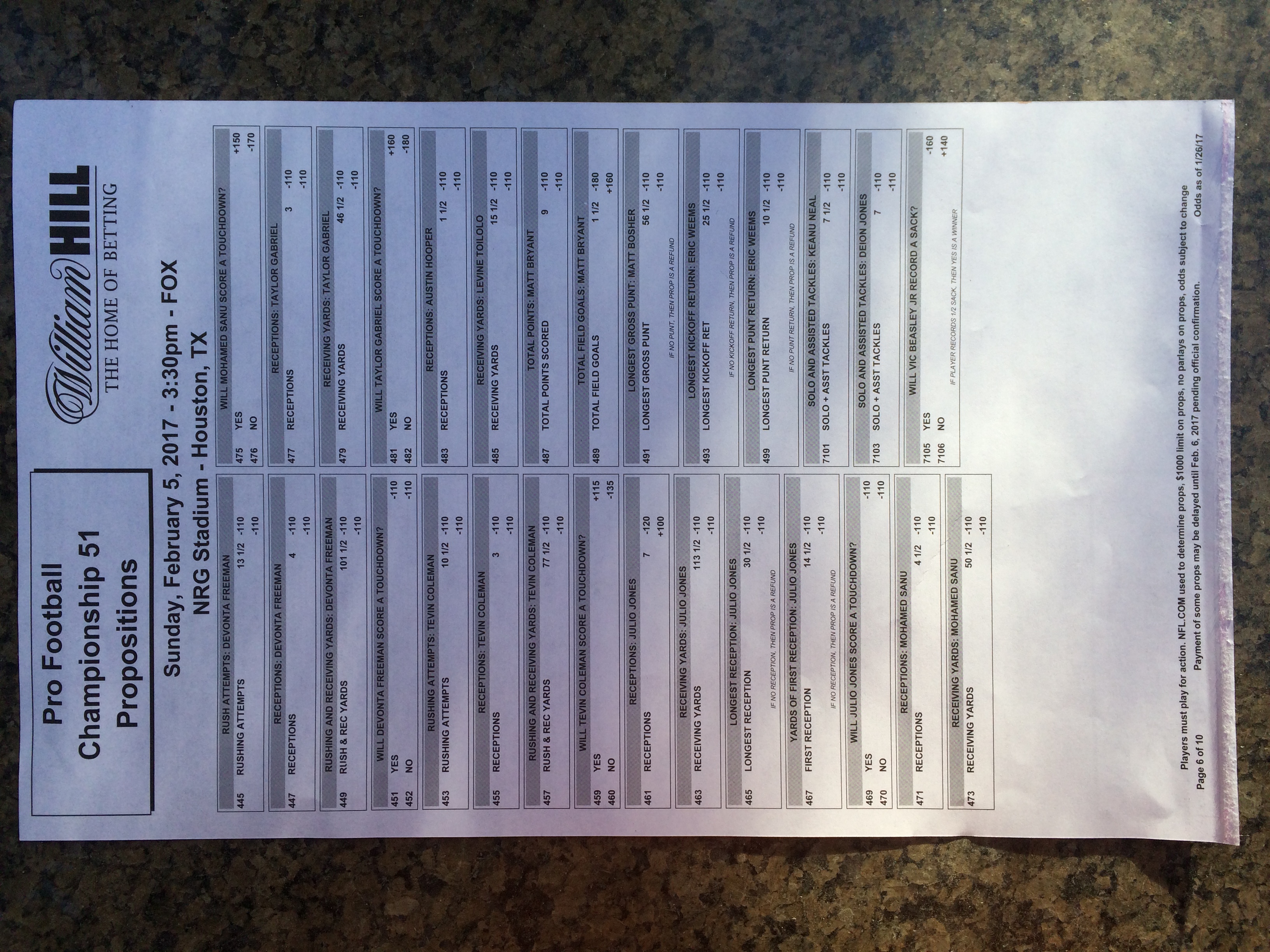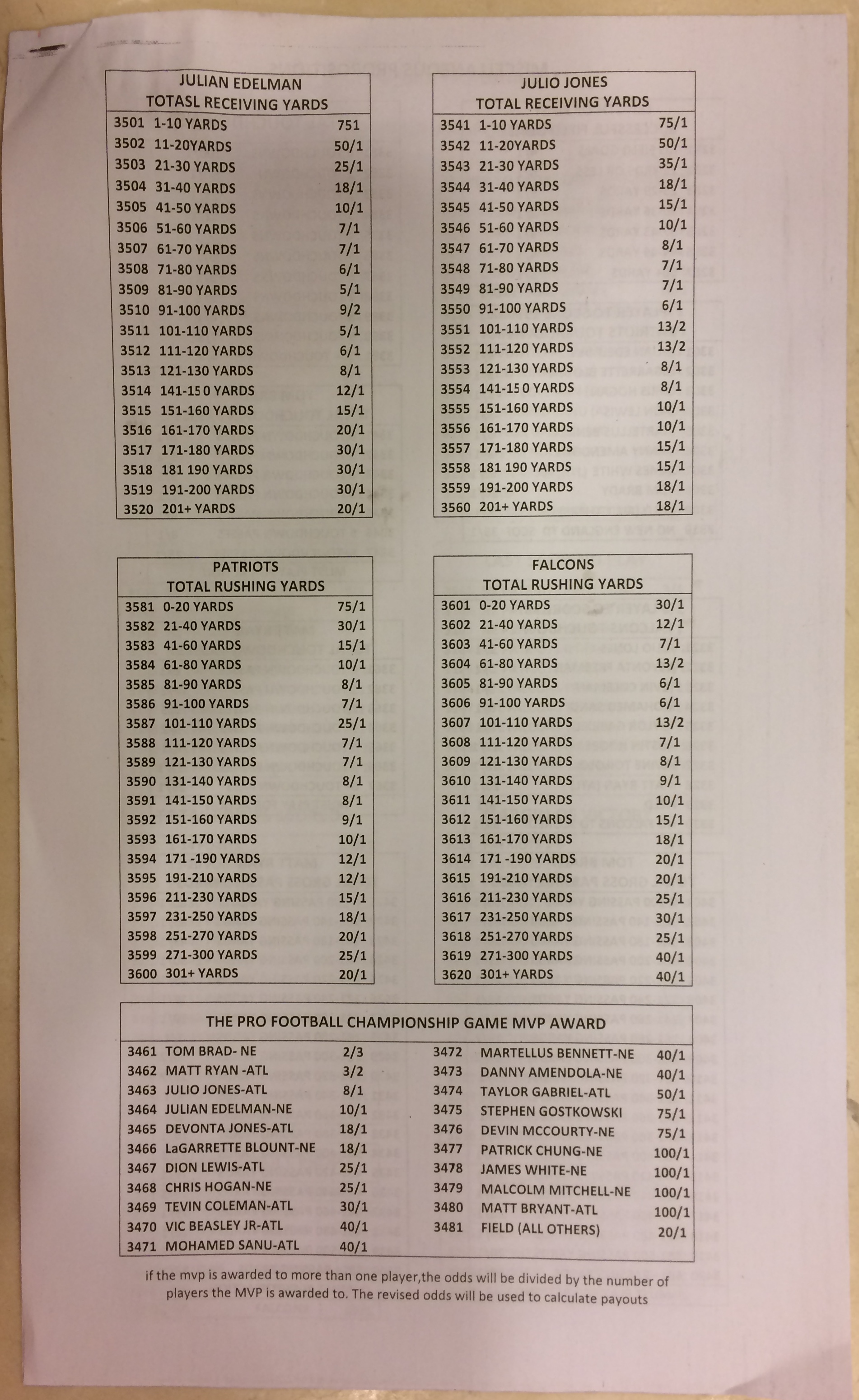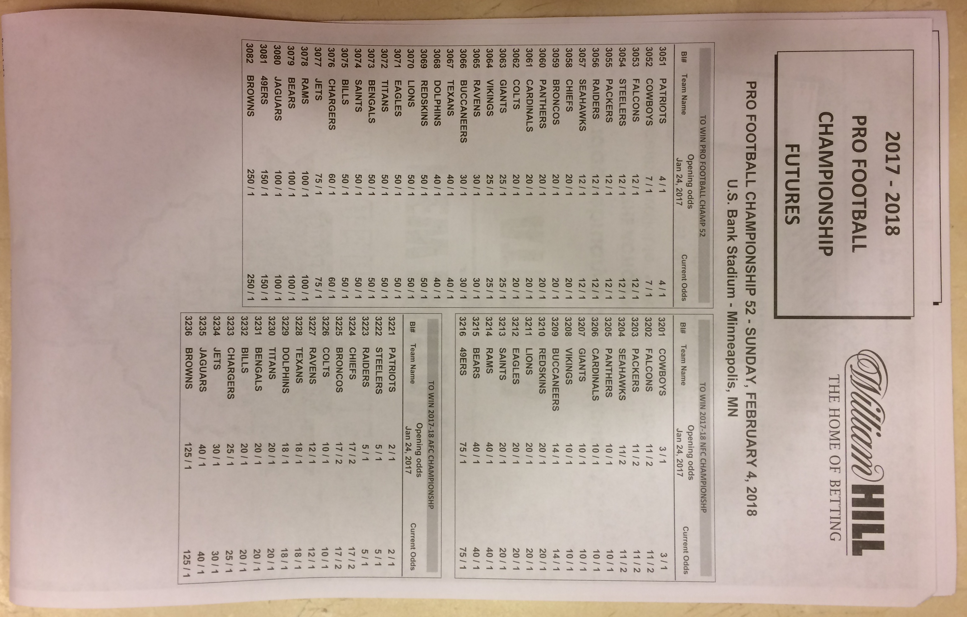 Embora eu não vá dar nenhum palpite este ano, você pode pelo menos ver o que está disponível. Aqui estão algumas imagens de planilhas de apostas para o Super Bowl 51. Mais devem aparecer nos dias que antecedem o jogo.