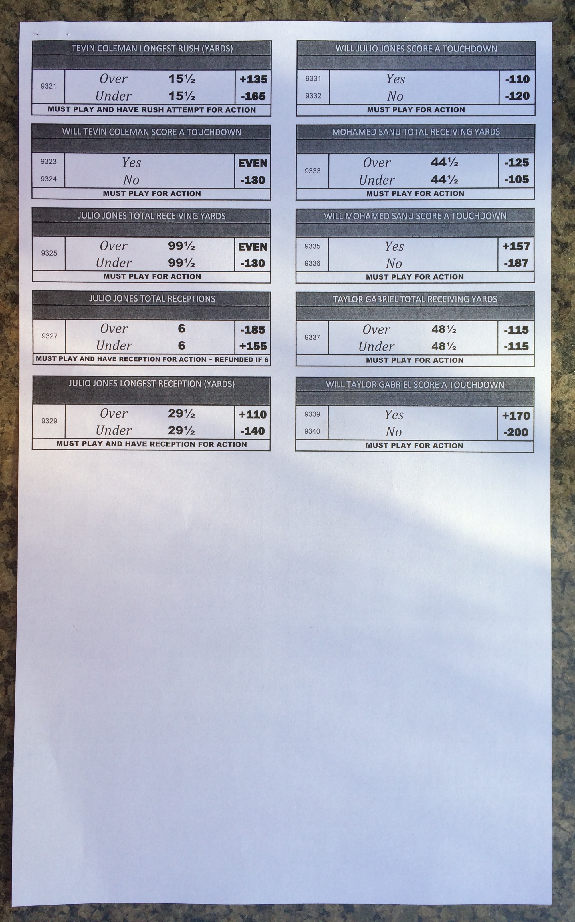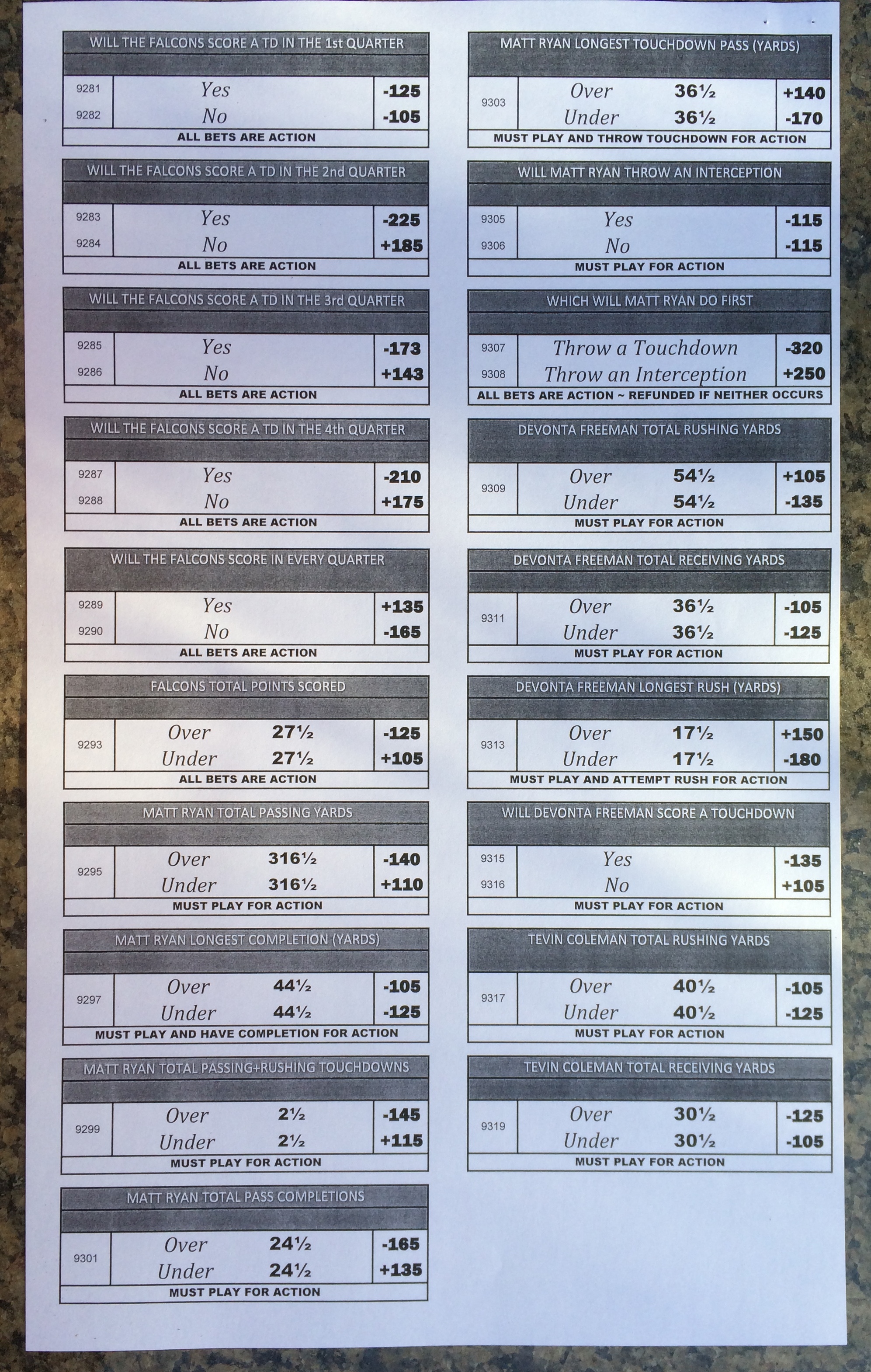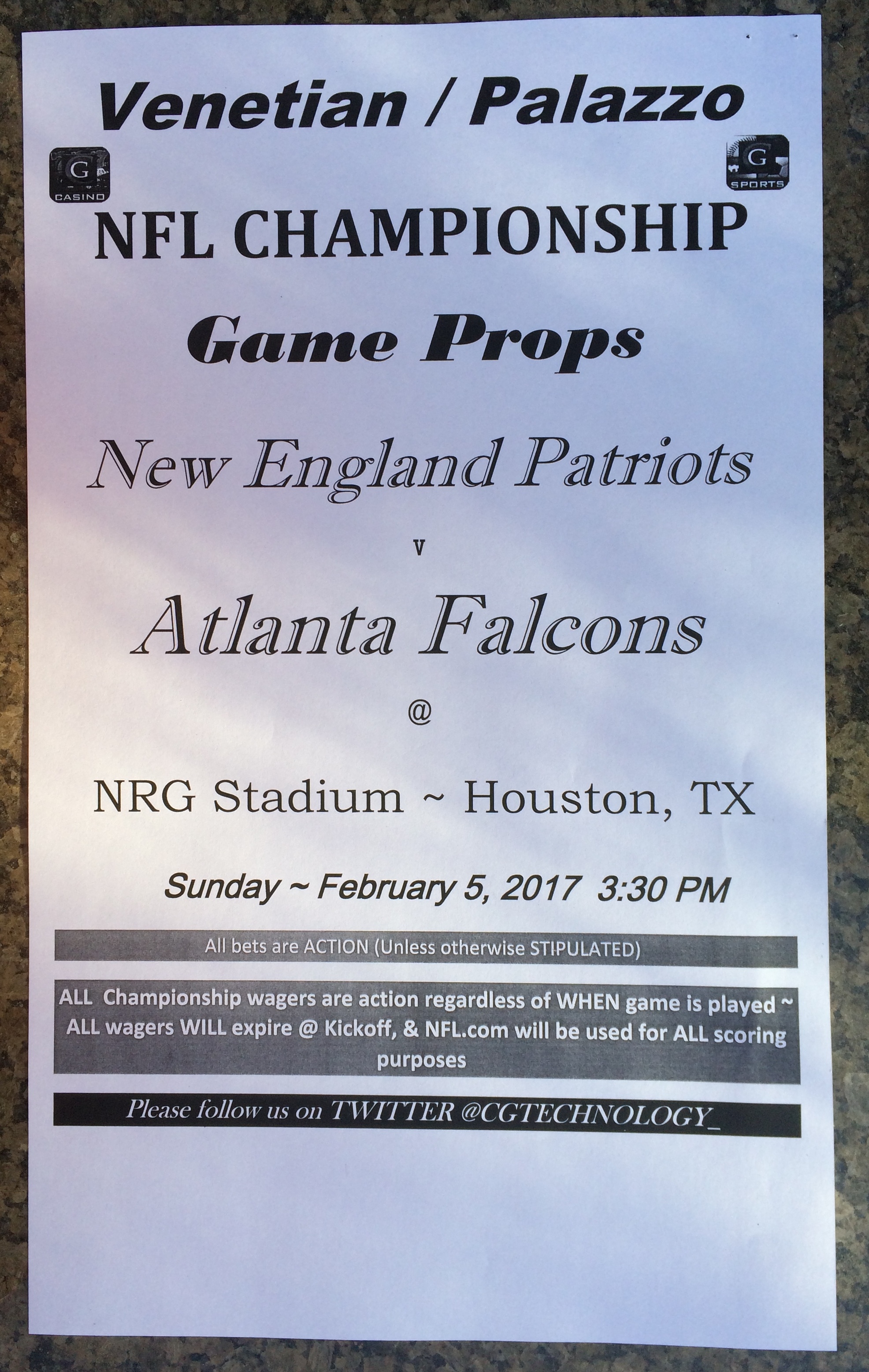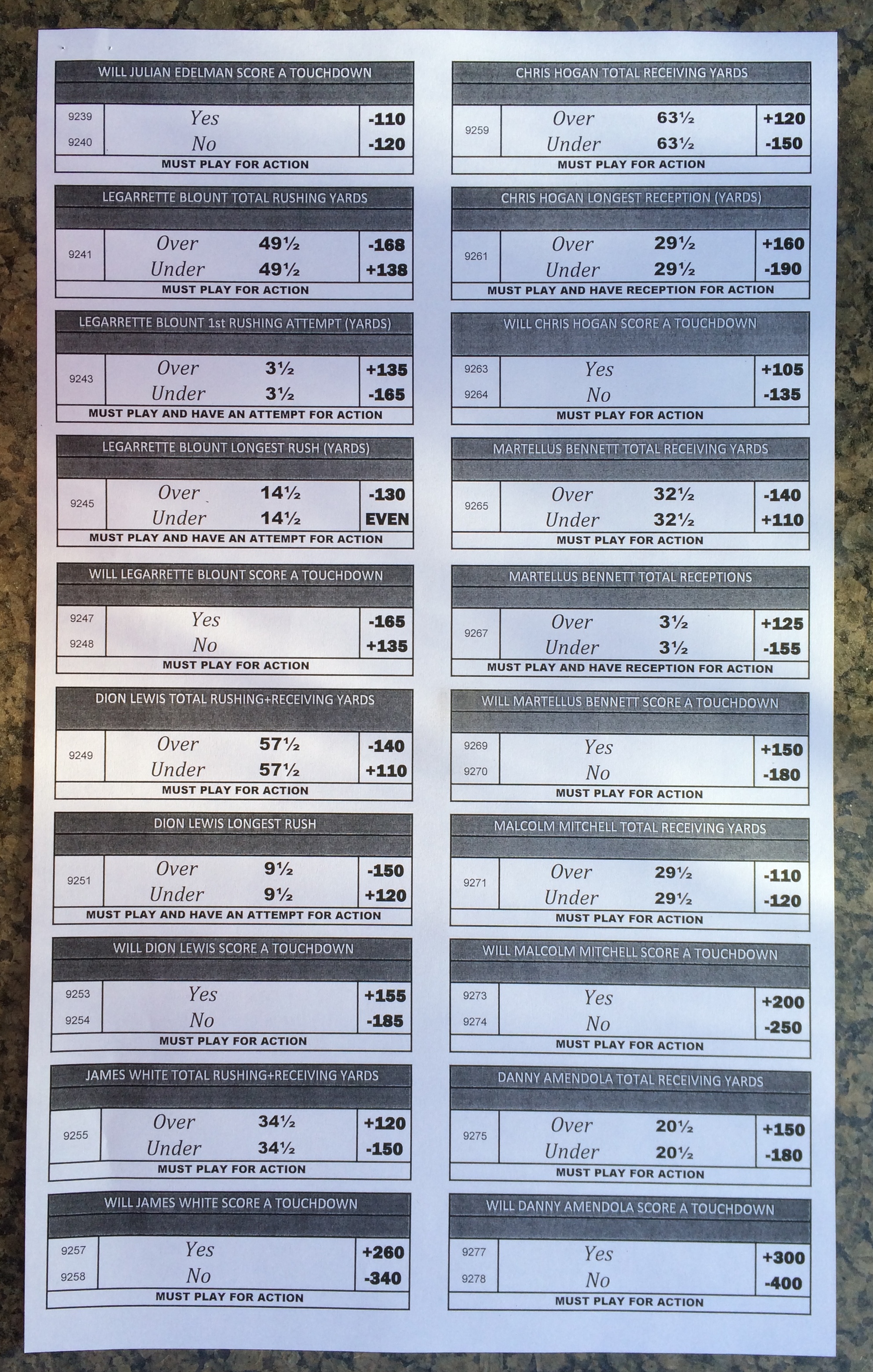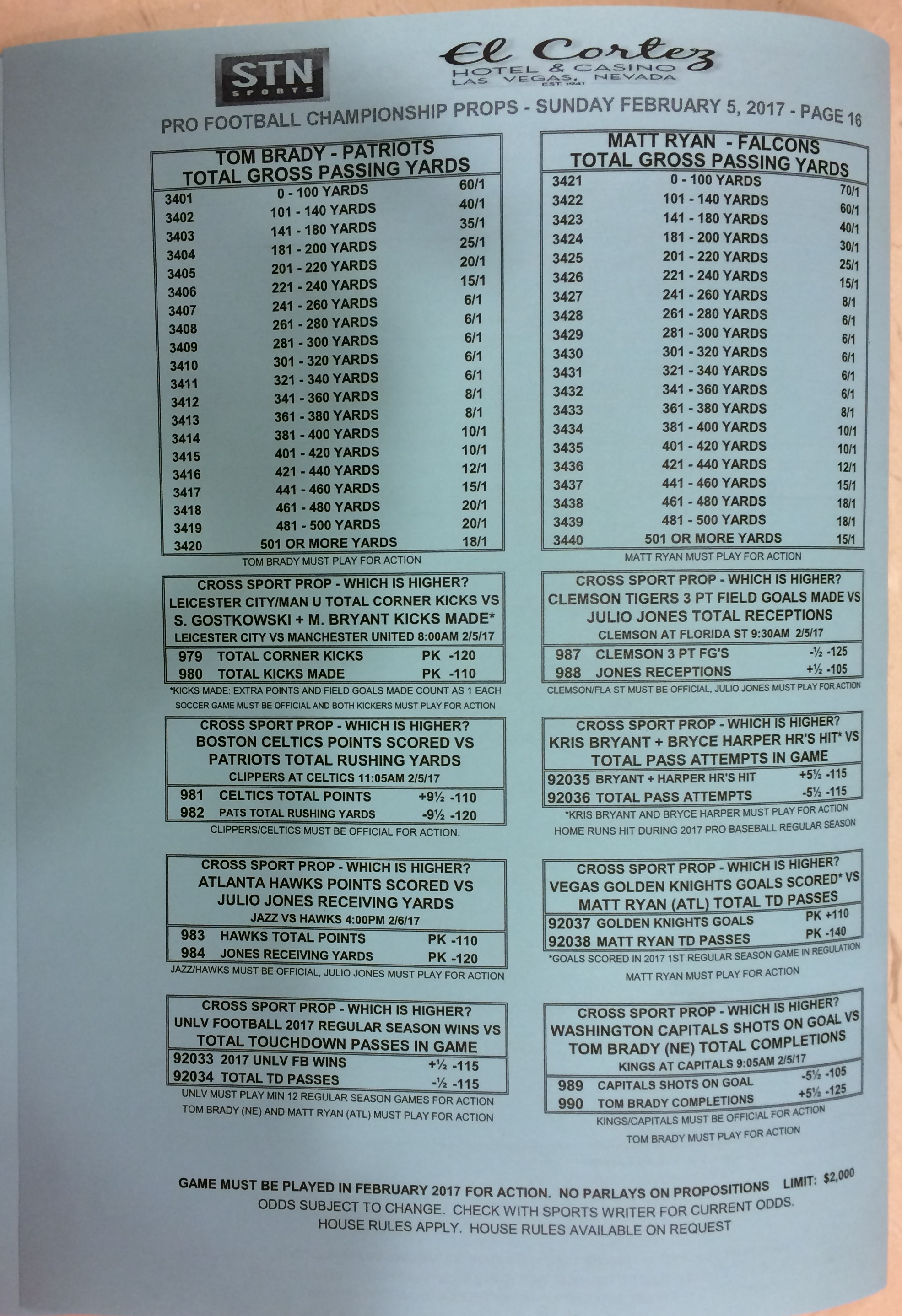 Embora eu não vá dar nenhum palpite este ano, você pode pelo menos ver o que está disponível. Aqui estão algumas imagens de planilhas de apostas para o Super Bowl 51. Mais devem aparecer nos dias que antecedem o jogo.