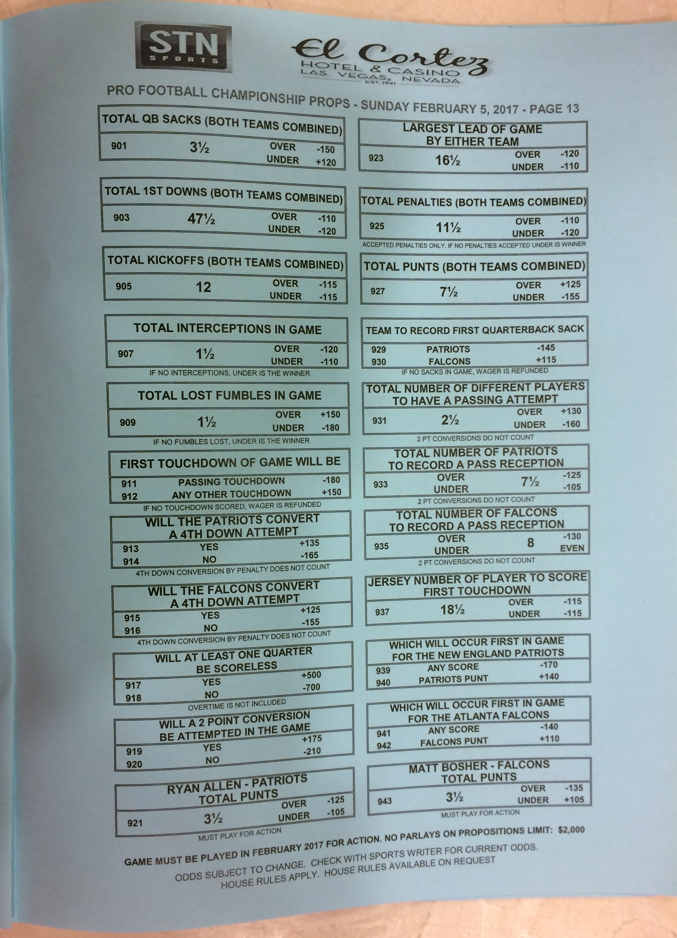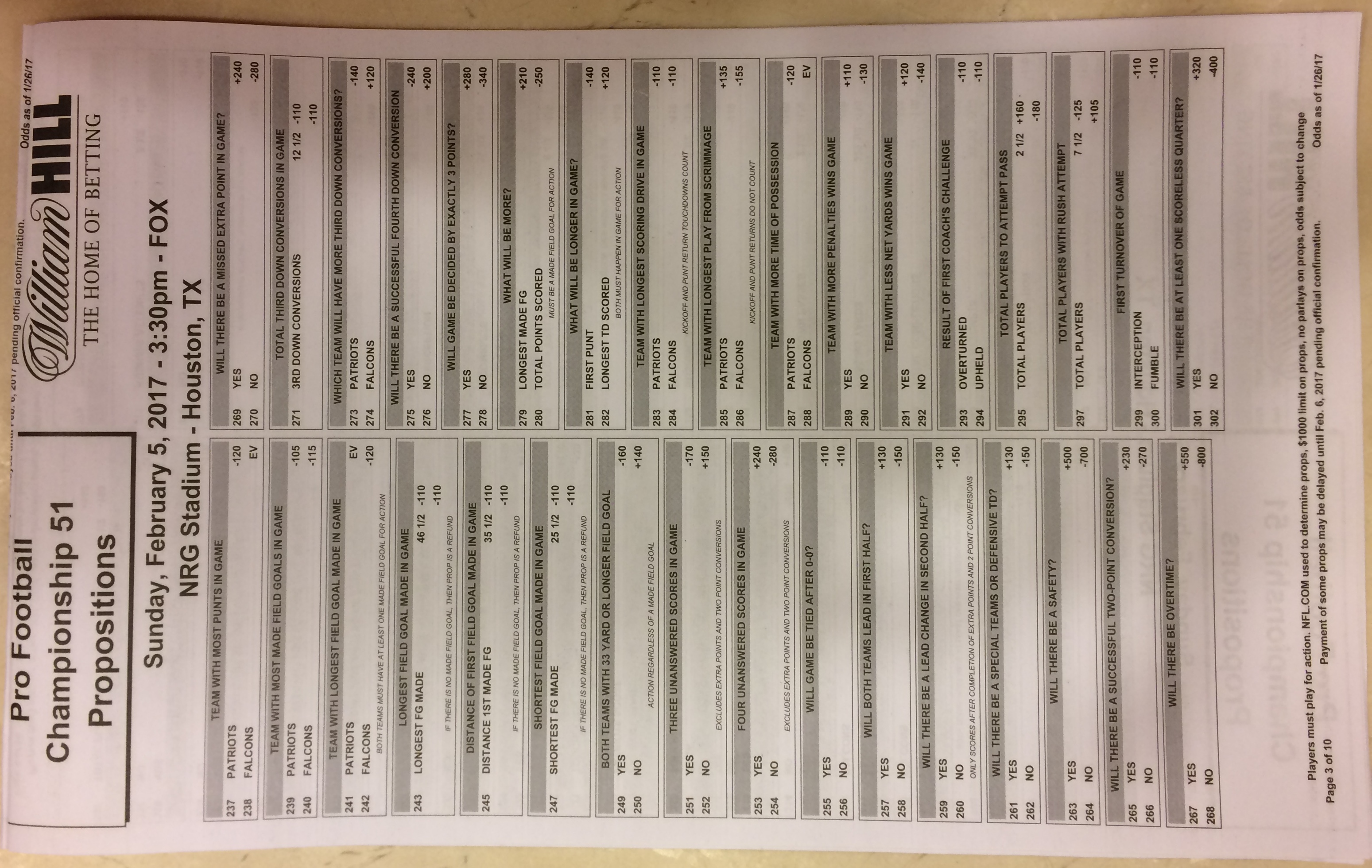 - Lista completa das apostas especiais do Super Bowl 51 da Westgate Superbook, conforme LasVegasSun.com.