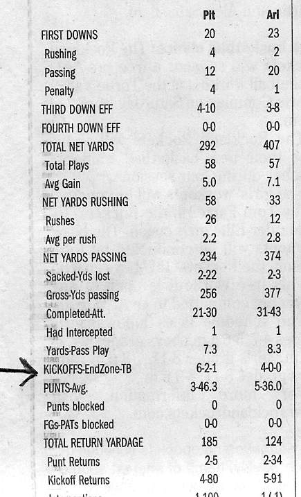 Aplaudo a Pinnacle por essa decisão.Não há dúvidas de que os Cardinals deram quatro chutes iniciais: três para cada touchdown e um para o início do primeiro tempo. No entanto, existe alguma controvérsia sobre o número de chutes iniciais dos Steelers. Houve um para cada um dos dois touchdowns, um para os dois field goals e um para o início do segundo tempo. Não houve chute inicial após o segundo touchdown, pois ele ocorreu no final do primeiro tempo. O que está em discussão é se o chute livre após o safety deve ou não ser contabilizado.