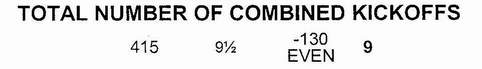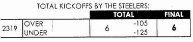 A imagem a seguir foi retirada da lista de apostas classificadas no Golden Nugget, referente ao número total de chutes iniciais do Steelers. Ela mostra que houve exatamente seis, portanto a aposta resultou em um empate para ambos os lados.