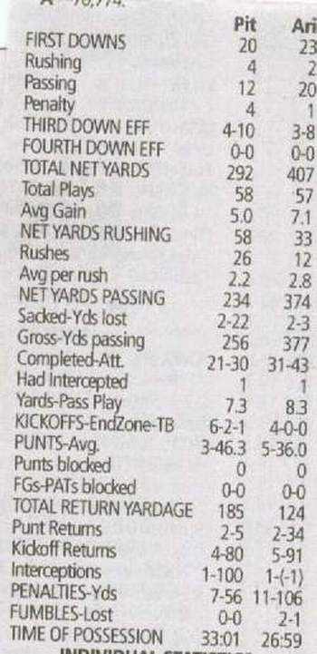 Os jornais noticiaram inicialmente seis chutes iniciais dos Steelers. Aqui estão recortes dos placares do Las Vegas Review Journal e do The Journal News (publicado no Condado de Rockland, NY) de 2 de fevereiro.