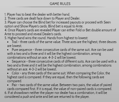 A OneTouch , fornecedora de jogos para cassinos online, tem um conjunto de regras significativamente diferente para o Teen Patti. Em vez de transcrevê-las na íntegra, mostrarei uma captura de tela da página de regras deles. Eles afirmam que o RTP é de 97,5%. Talvez algum dia eu mesmo analise isso.