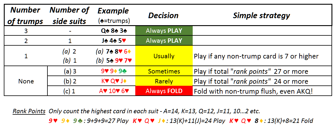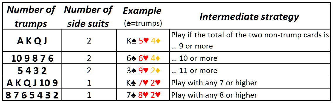 Use a estratégia simples, exceto se você tiver apenas uma carta trunfo; nesse caso, jogue da seguinte forma (caso contrário, desista):
