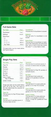 O "3 Dice Football" é um jogo novo que descobri no O'Shea's em 2 de abril de 2011. O jogo tenta simular o futebol americano usando três dados. O jogador pode apostar que uma determinada posse de bola resultará em um touchdown ou em uma perda de posse, além de várias apostas especiais em cada lançamento. É certamente um conceito novo e devo parabenizar o criador por tentar algo diferente, em vez das variantes usuais de blackjack e pôquer.Regras