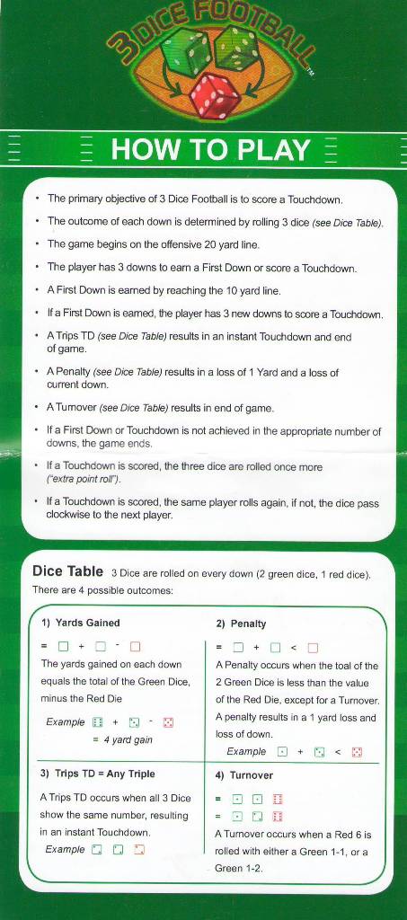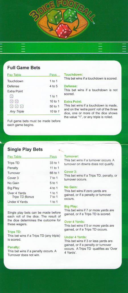 O "3 Dice Football" é um jogo novo que descobri no O'Shea's em 2 de abril de 2011. O jogo tenta simular o futebol americano usando três dados. O jogador pode apostar que uma determinada posse de bola resultará em um touchdown ou em uma perda de posse, além de várias apostas especiais em cada lançamento. É certamente um conceito novo e devo parabenizar o criador por tentar algo diferente, em vez das variantes usuais de blackjack e pôquer.Regras