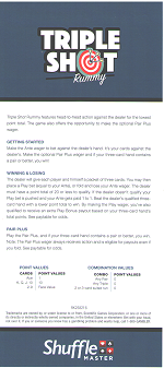 Vi o Triple Shot Rummy pela primeira vez na Global Gaming Expo de 2015. Pelo que sei, sua estreia em cassinos foi no cassino Rampart, em Las Vegas, em 11 de fevereiro de 2016. Tirando uma mudança nas apostas paralelas, é igual ao Vegas Three Card Rummy , que já é jogado em alguns cassinos online há anos. As regras são semelhantes às do Three Card Poker, exceto que a pontuação das mãos é bem diferente.