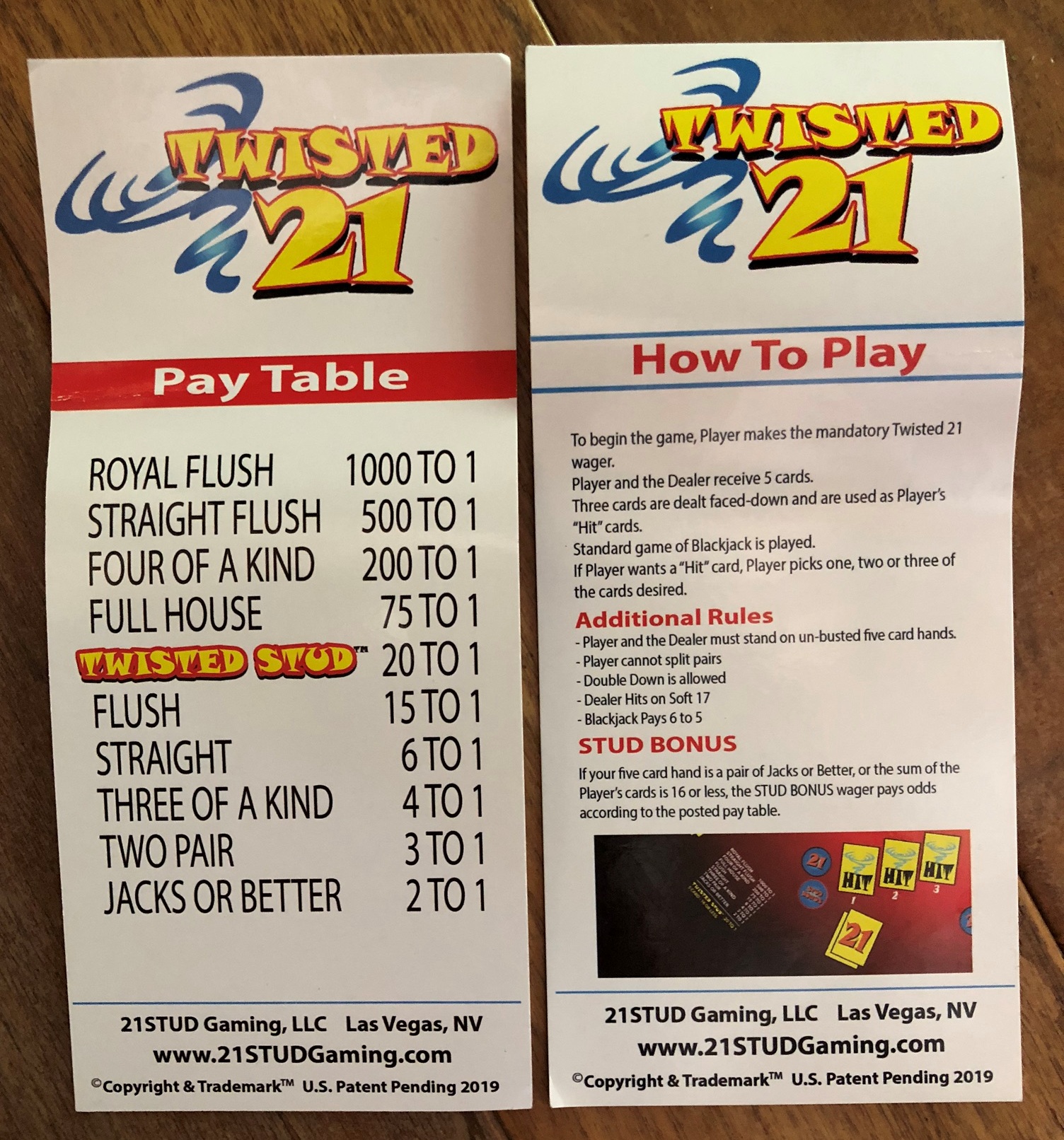- Um "Twisted Stud" é uma mão com 16 pontos ou menos que, de outra forma, não pagaria. Para a contagem de pontos, os ases valem um ponto. Por exemplo, AA-2-3-3 pagaria 3 para 1 como um par de duas cartas, apesar de ter apenas 10 pontos.