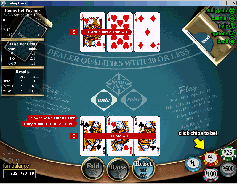 - O jogo começa com o jogador fazendo uma aposta inicial (ante) mais uma aposta bônus opcional.