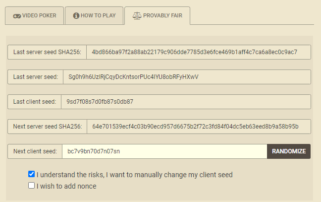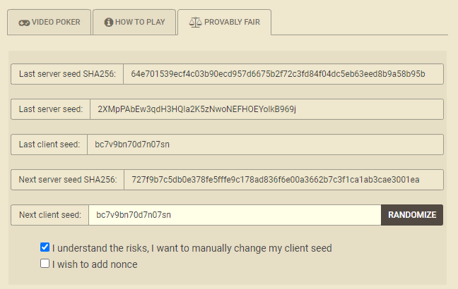 Esta versão de vídeo pôquer parece ser jogada exclusivamente em cassinos online que aceitam criptomoedas . Resumidamente, o jogo encontra dez números aleatórios únicos de 0 a 51, cada um com probabilidade de 1/52, e os associa a dez cartas do baralho. Os cinco primeiros números determinam as cartas que o jogador receberá na distribuição inicial e os cinco últimos determinam as cartas que o jogador receberá, em ordem, na compra. Por exemplo, se o jogador descartar duas cartas, ele receberá a 6ª e a 7ª carta da lista na compra. A posição das cartas descartadas não importa.
