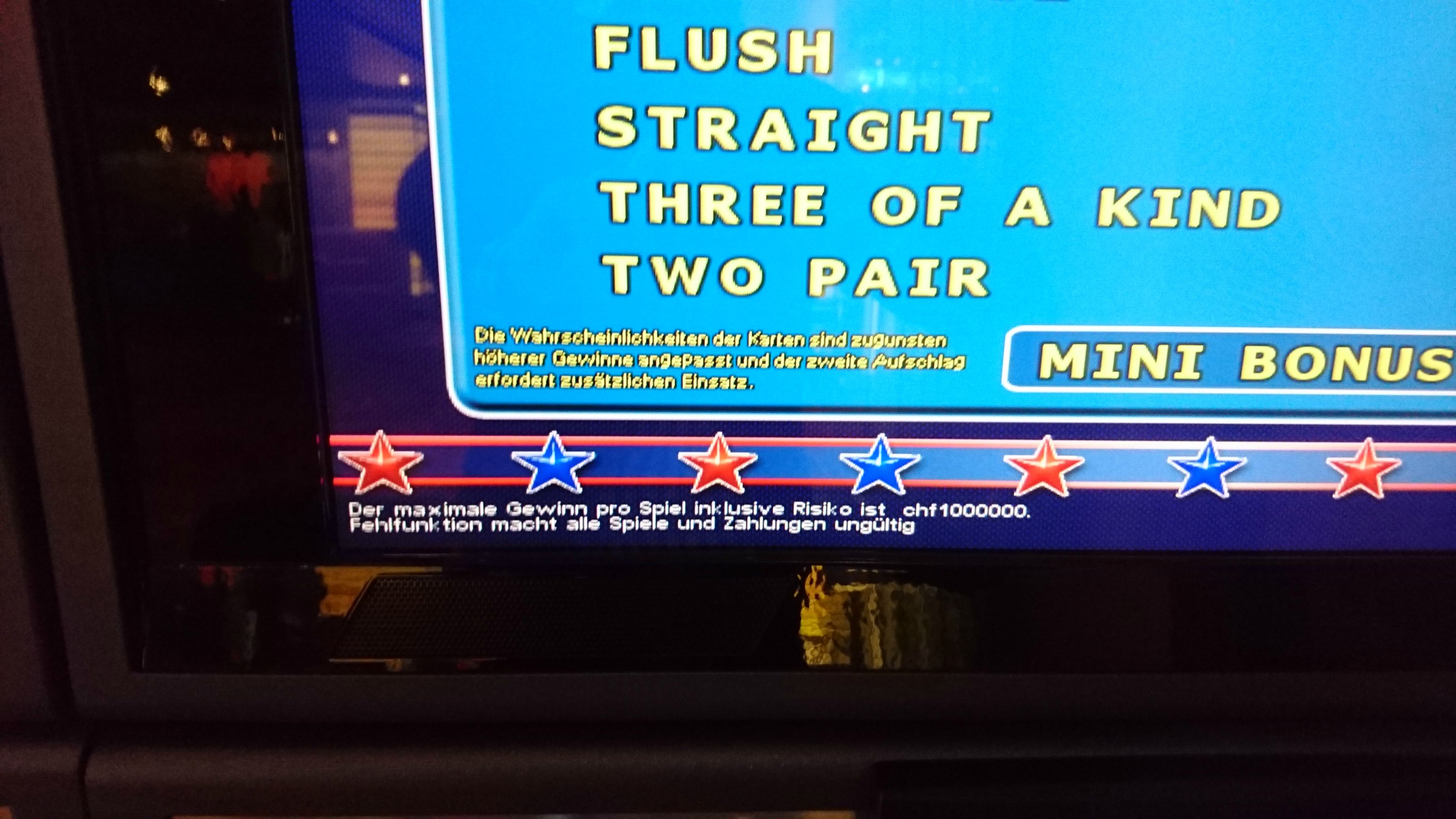 - Para complicar ainda mais as coisas, o jogador não tem apenas um medidor de créditos, mas dois. Pelo que entendi, o valor inicial da aposta vai para o "geldspeicher" (saldo inicial). Qualquer ganho vai para um segundo medidor chamado "punkte-bank" (banco de pontos). As apostas feitas saem primeiro do "punkte-bank", mas se este estiver zerado, então são debitadas do "geldspeicher". Algumas máquinas podem ter maneiras de transferir créditos entre os dois medidores, ou isso pode acontecer automaticamente. No entanto, nada disso importa muito. Não faço ideia de por que precisam de dois medidores.