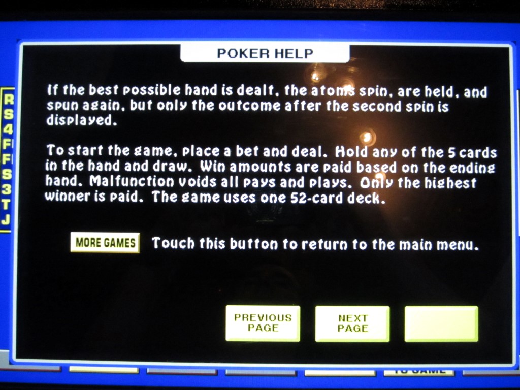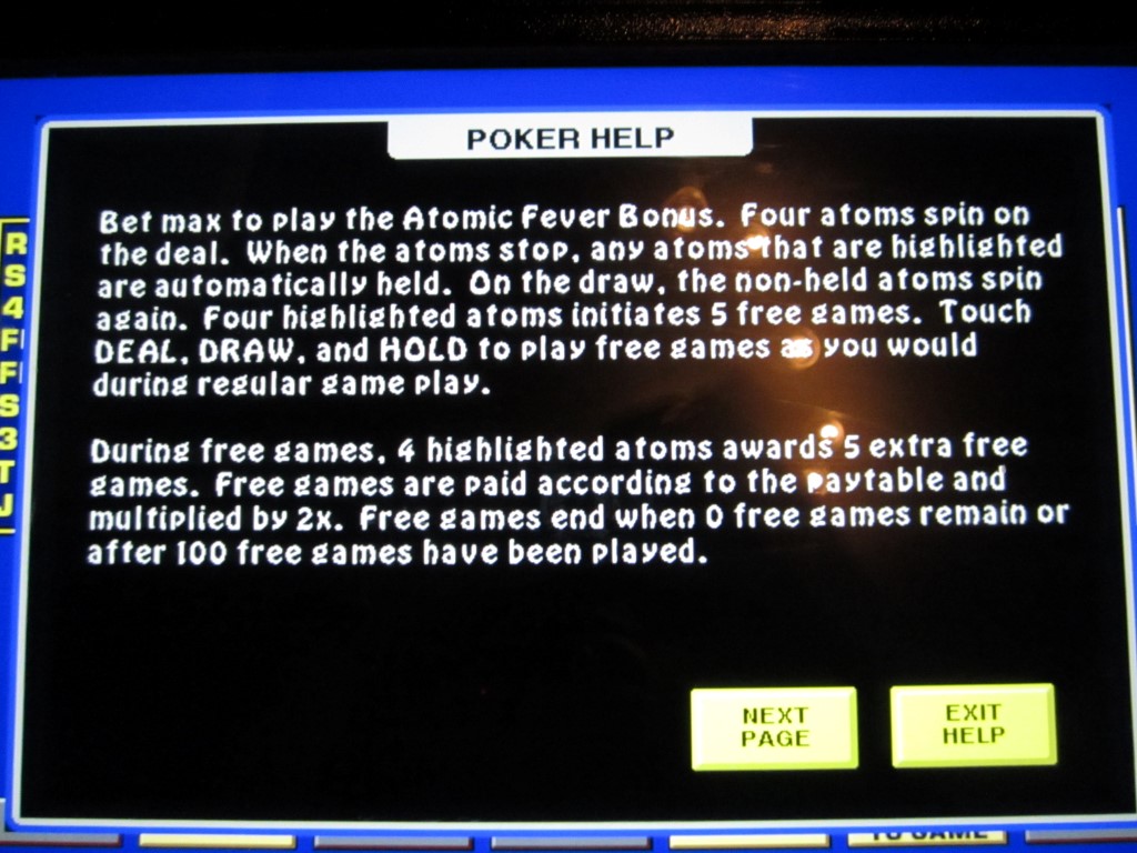 Atomic Fever é uma variante de video poker que vi num bar de Las Vegas em março de 2014. Funciona como um video poker normal, mas inclui um recurso bônus. Ao custo de uma sexta ficha, o jogador concorre a um bônus de jogo grátis. Para ganhar o bônus, é preciso carregar (ou destacar) quatro átomos.
