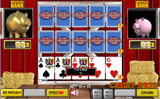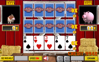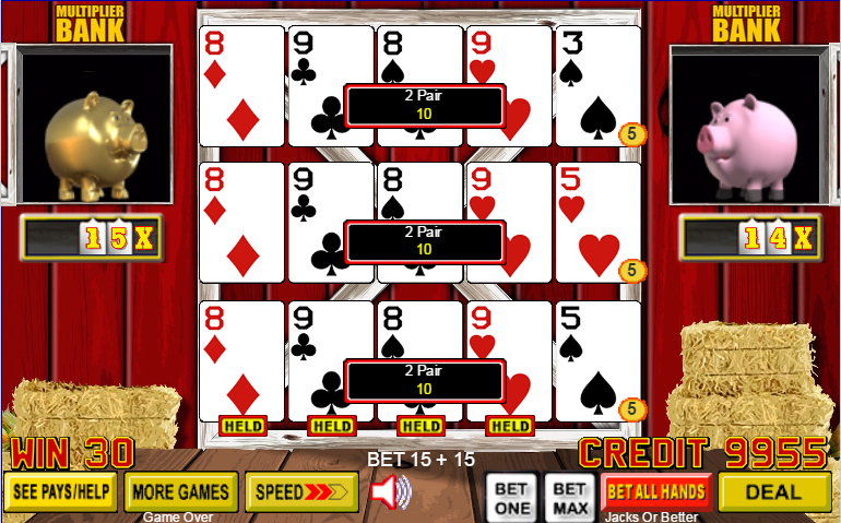 Barnyard Poker é uma variante de vídeo pôquer da IGT/Action Gaming. Eu a vi pela primeira vez em julho de 2015 no cassino Suncoast em Las Vegas. A essência do jogo é que o jogador acumula multiplicadores para cada par ou melhor na mão inicial. Esses multiplicadores acumulados são concedidos aleatoriamente.