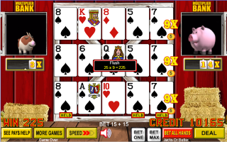 A mão do meio evoluiu para um flush que, no jogo Jacks or Better que eu estava jogando, paga 5 por crédito apostado. Com uma aposta base de 5 créditos por mão e um multiplicador de 9x, o ganho total foi de 5×5×9=225 créditos.