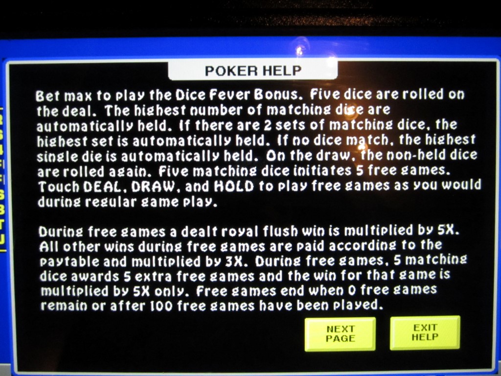 Dice Fever é uma variante de video poker que vi num bar de Las Vegas em março de 2014. Funciona como o video poker tradicional, mas inclui um recurso bônus. Ao custo de uma sexta ficha, o jogador concorre a uma rodada grátis. O bônus é obtido se o jogador conseguir uma combinação de cinco dados iguais em duas jogadas.