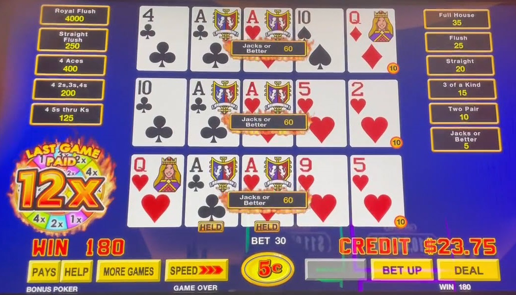 Nenhuma das mãos melhorou. Com três vitórias de 5 para o par alto e um multiplicador de 12x, meu ganho total foi de 5×3×12 = 180 créditos.