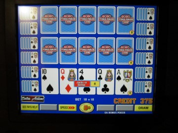Neste exemplo, fiz uma aposta de 30 créditos. Quinze créditos foram para três mãos de vídeo poker Triple Play normal, a 5 créditos cada. Os outros 15 créditos habilitaram o recurso Extra Draw, que oferece 12 mãos adicionais.