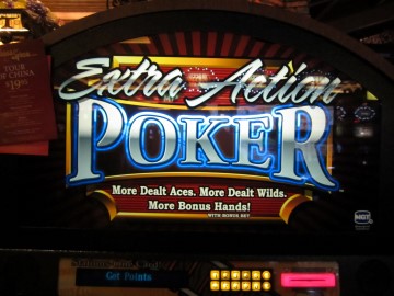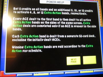 Extra Action Poker é uma variante de video poker que observei no Green Valley Ranch em 23 de fevereiro de 2014. O jogo funciona como o video poker convencional, exceto por uma aposta adicional: o jogador ganha mãos bônus se conseguir pelo menos um ás (ou um dois em jogos com curinga). Seguem as regras completas.