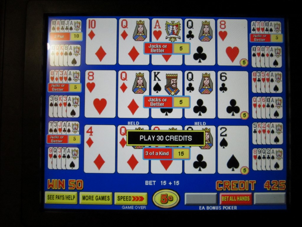 Neste exemplo, fiz uma aposta de 30 créditos. Quinze créditos foram para três mãos de vídeo poker Triple Play normal, a 5 créditos cada. Os outros 15 créditos habilitaram o recurso Extra Draw, que oferece 12 mãos adicionais.