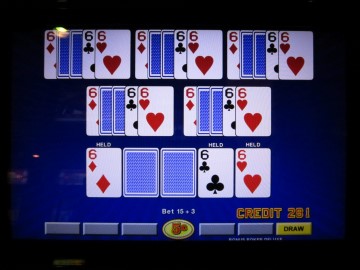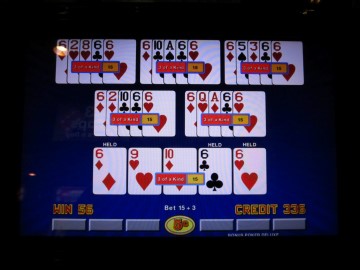 Joguei video poker triple-play e apostei seis moedas por mão para ativar o recurso, totalizando 18 créditos. Depois de um tempo, recebi três seis. O jogo então rapidamente exibiu a seguinte tela de recursos. Nela, você pode ver um total de seis mãos. Três são as que eu paguei e as outras três são mãos Extra Draw.