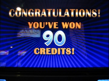 O jogo anunciou meus ganhos nas mãos extras. Cada uma das seis trincas pagou 15 créditos, então meu "ganho" foi de 6 × 15 = 90 créditos. Minha aposta inicial foi de 18 créditos, então meu ganho líquido foi de 90 - 18 = 72 créditos.