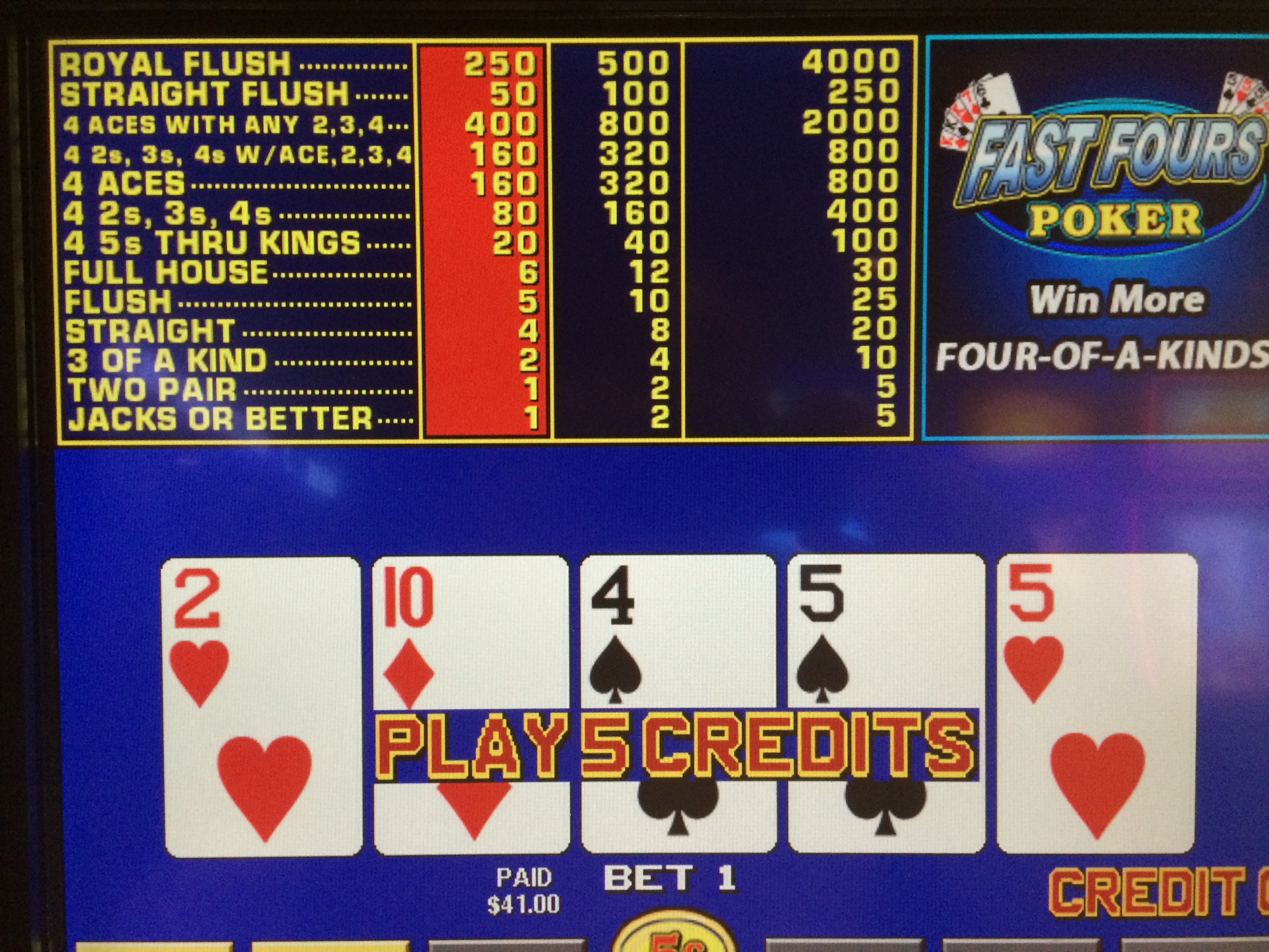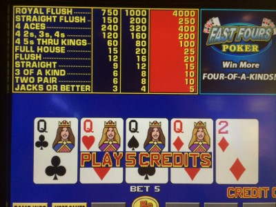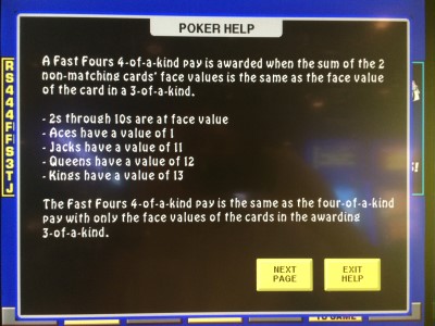 Fast Fours é uma variação de video poker que notei no Hard Rock em Las Vegas, no dia 5 de abril de 2016. Era uma máquina antiga, então presumo que o jogo já exista há algum tempo e tenha passado despercebido por mim. A grande sacada do jogo é muito parecida com Quick Quads : se o jogador tiver uma trinca, como 8-8-8-5-3, e os dois ases individuais somarem o valor da trinca, então a pontuação é considerada uma quadra. Assim como em Quick Quads, os ases valem um ponto e de 2 a 10 pontos em valor de pip. Diferentemente de Quick Quads, as figuras (valete, dama e rei) também influenciam. Mais especificamente, um valete vale 11 pontos, uma dama 12 e um rei 13. Portanto, um 2JKKK contaria como quatro reis. Outra diferença é que, em Fast Fours, o jogador não precisa apostar uma sexta moeda para ativar o recurso. O pagamento é feito pressionando a tabela de pagamentos.