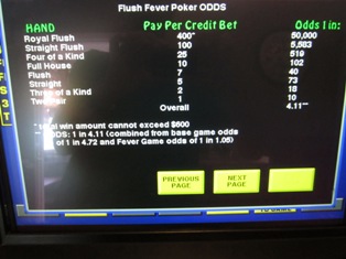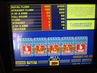 Flush Fever é um jogo de video poker que vi na pizzaria Figaro's em Philomath, Oregon, no dia 21 de junho de 2011. Estava numa máquina IGT Game King com o título "Video Lottery" na parte superior. Embora o jogo seja administrado pela Loteria do Oregon, as cartas são distribuídas de forma tão justa e aleatória quanto em Nevada, de acordo com os regulamentos de jogos do Oregon. Em particular, o Regulamento 177-200-0070 .