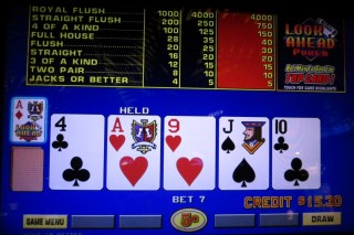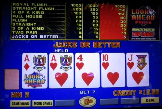 No vídeo pôquer convencional, a jogada correta nessa situação seria manter o ás e o valete. No entanto, sabendo que a próxima carta é o ás de ouros, opto por manter apenas o ás de copas.