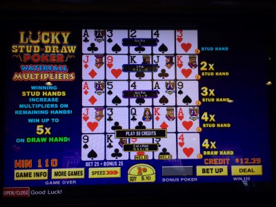 Lucky Stud Draw Poker é uma variante de vídeo poker onde o jogador joga uma mão de descarte (draw hand) e cinco mãos de stud. Se alguma mão de stud vencer, as mãos abaixo dela na tela recebem um multiplicador. A mão de descarte fica na parte inferior, portanto, tem um multiplicador máximo de 5x.
