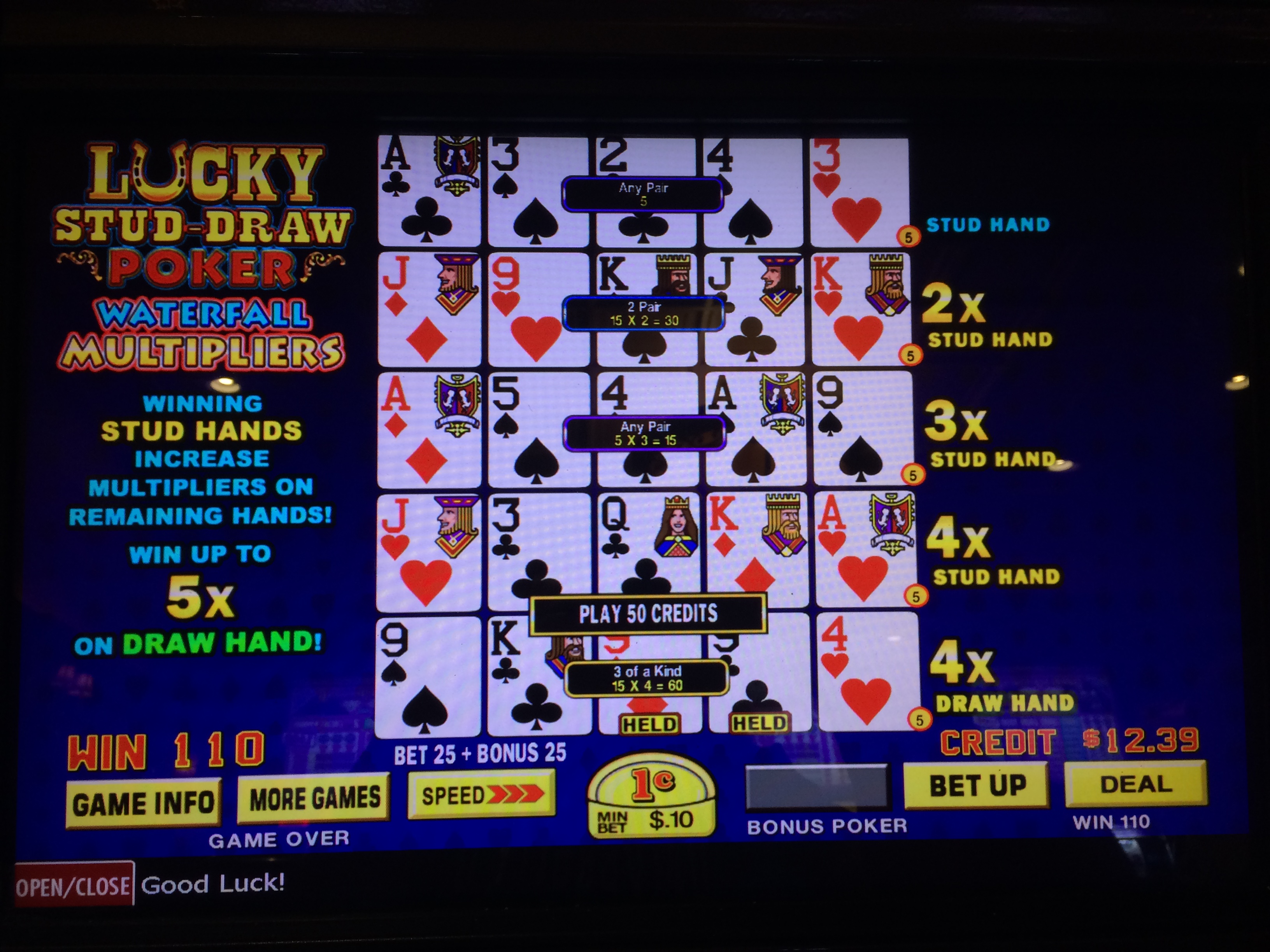 Lucky Stud Draw Poker é uma variante de vídeo poker onde o jogador joga uma mão de descarte (draw hand) e cinco mãos de stud. Se alguma mão de stud vencer, as mãos abaixo dela na tela recebem um multiplicador. A mão de descarte fica na parte inferior, portanto, tem um multiplicador máximo de 5x.