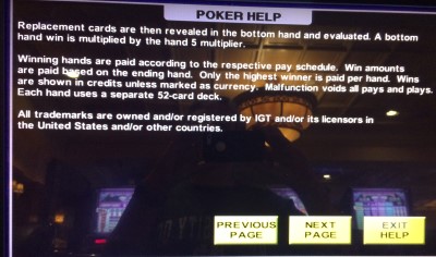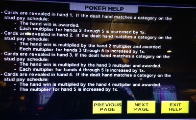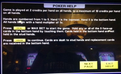 O jogador não tem controle sobre as mãos do stud, que são distribuídas a partir de baralhos separados. Portanto, a estratégia é exatamente a mesma do vídeo poker convencional para o jogo de draw poker e a tabela de pagamentos em questão. Vi o jogo no Palace Station em Las Vegas no dia 31 de maio de 2017. Ele fica perto do pub irlandês.