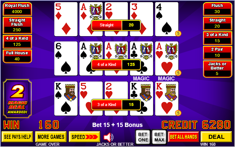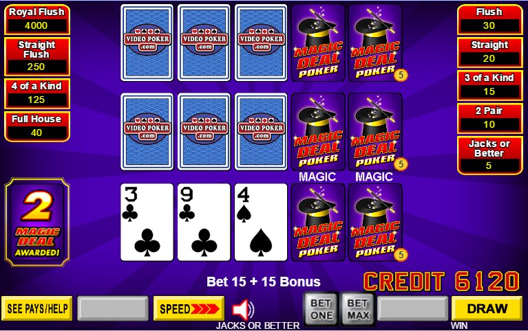 Magic Deal é uma variante de video poker que é adicionada às máquinas convencionais de video poker de três, cinco e dez linhas. O jogador pode jogar normalmente ou pagar uma taxa equivalente à aposta máxima de cinco moedas por linha para ativar o recurso Magic Deal. Se o recurso estiver ativo, o jogo distribuirá aleatoriamente ao jogador de uma a três cartas Magic Deal, que funcionam como curingas.
