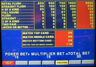 - O jogador faz uma aposta de 30 créditos. 15 créditos são para três mãos de cinco créditos cada, com base no video poker Triple Play padrão. Os outros 15 créditos servem para ativar o recurso Match Card.