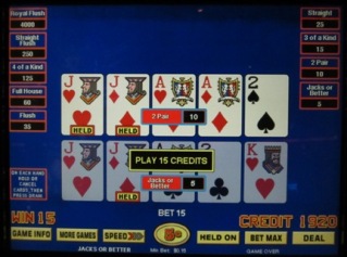 No exemplo acima, a única carta que eu tinha após a distribuição era o valete de ouros. Na primeira compra, ele se transformou em um par de valetes, que pagou 5 créditos. Eu então mantive esse par e ele se transformou em um par duplo na segunda compra, que pagou 10 créditos. Meu "ganho" total foi de 5 + 10 = 15 créditos. Como essa foi minha aposta inicial, na verdade fiquei no zero a zero.