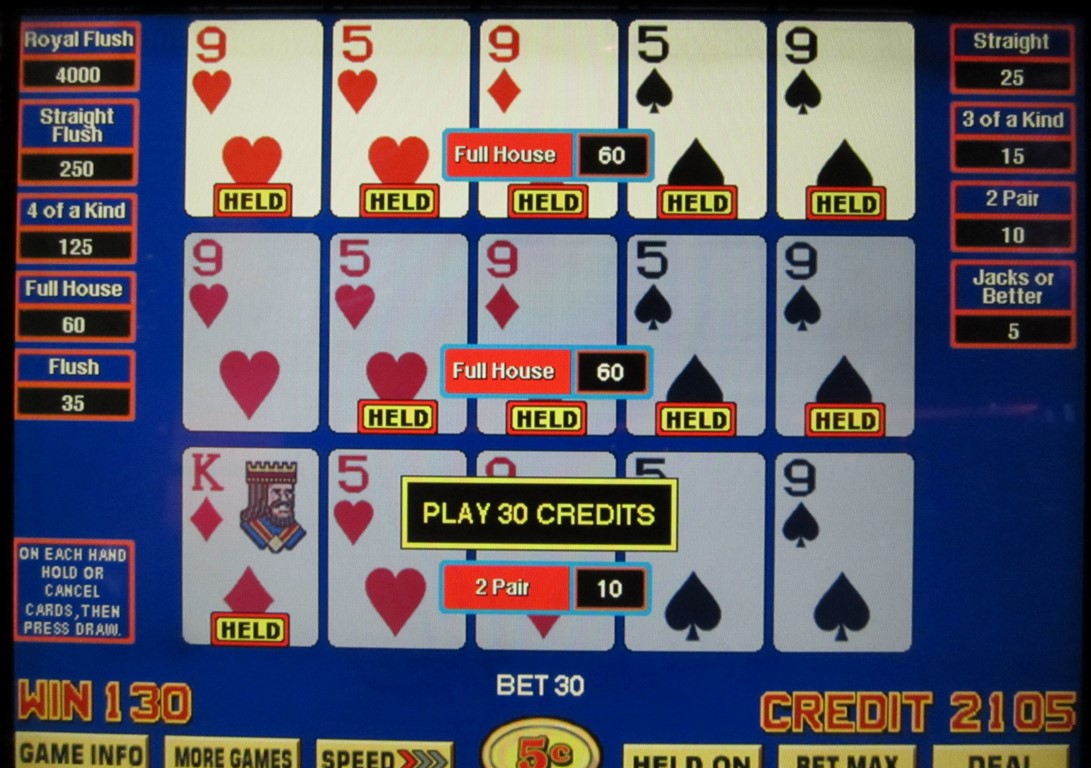 Nessa mão, a única carta que eu tinha após a distribuição era o rei de ouros. Na primeira compra, ele melhorou para um par, que pagou 10 créditos. Eu ainda tinha o par e, na segunda compra, ele melhorou para um full house, que pagou 60 créditos. Na terceira compra, eu tinha o full house completo, que também pagou 60 créditos. Meu "ganho" total foi de 10 + 60 + 60 = 130 créditos. Minha aposta inicial foi de 30 créditos, então meu lucro foi de 100 créditos.