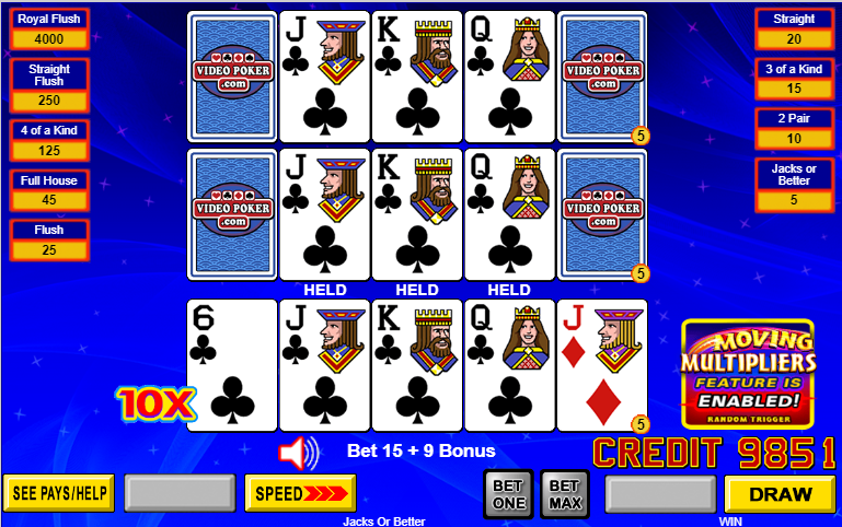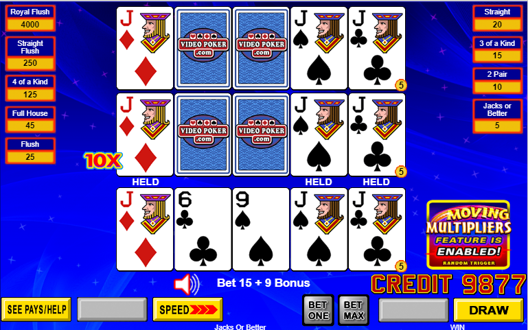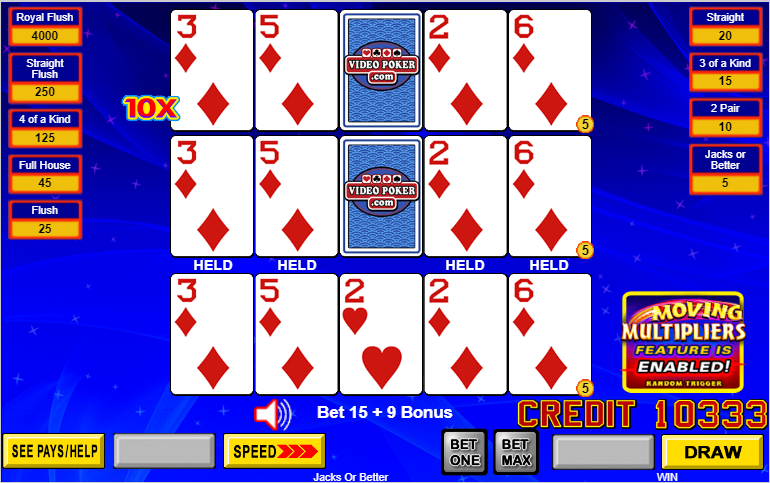 - O recurso de Multiplicadores Móveis é adicionado às máquinas de videopôquer multijogador convencionais de 3, 5 e 10 jogadores. Presume-se que o leitor já esteja familiarizado com o funcionamento do pôquer multijogador.