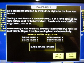 - Se o jogador conseguir duas, três ou quatro cartas para um Royal Flush na distribuição inicial, com a funcionalidade Royal Hunt em jogo, ele receberá seis mãos bônus. Essas seis mãos bônus incluirão automaticamente as cartas reais da distribuição inicial.