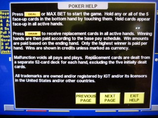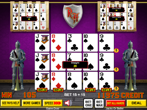 A mão bônus do meio à esquerda também evoluiu para uma sequência. Como mão bônus, pagou 45 créditos. As duas mãos bônus superiores à direita evoluíram para pares altos, rendendo 20 créditos cada. Meu ganho total foi, portanto, de 20 + 45 + 20 + 20 = 105 créditos.