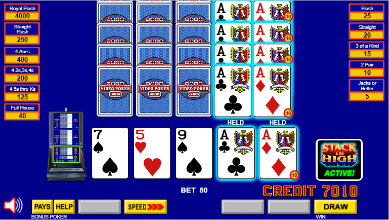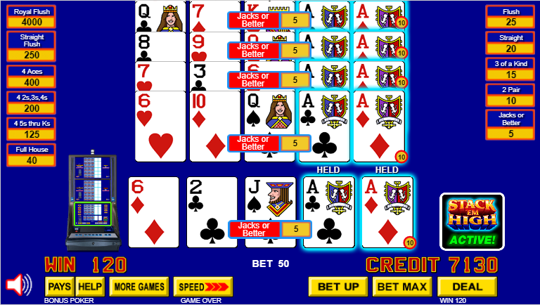 Uma variante de video poker que vi na G2E e que agora está disponível no VideoPoker.com é o Stack 'em High Poker.