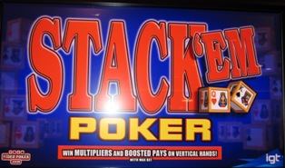 Stack 'em Poker é uma variante de vídeo pôquer que observei no Harrah's Las Vegas em 17 de setembro de 2014. Funciona como um vídeo pôquer de cinco mãos, com cinco mãos empilhadas verticalmente. Se o jogador fizer uma aposta adicional, ele se qualifica para ganhos formados por mãos tanto na horizontal quanto na vertical.