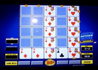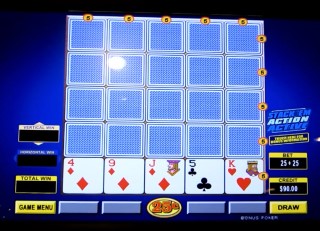 - Nesta funcionalidade, o jogador também se qualifica para mãos vencedoras formadas por mãos horizontais em qualquer posição em que tenha descartado cartas. Por exemplo, se o jogador descartar três cartas, ele se qualifica para quaisquer vitórias criadas pelas cartas de reposição nas três colunas preenchidas com cartas de reposição.